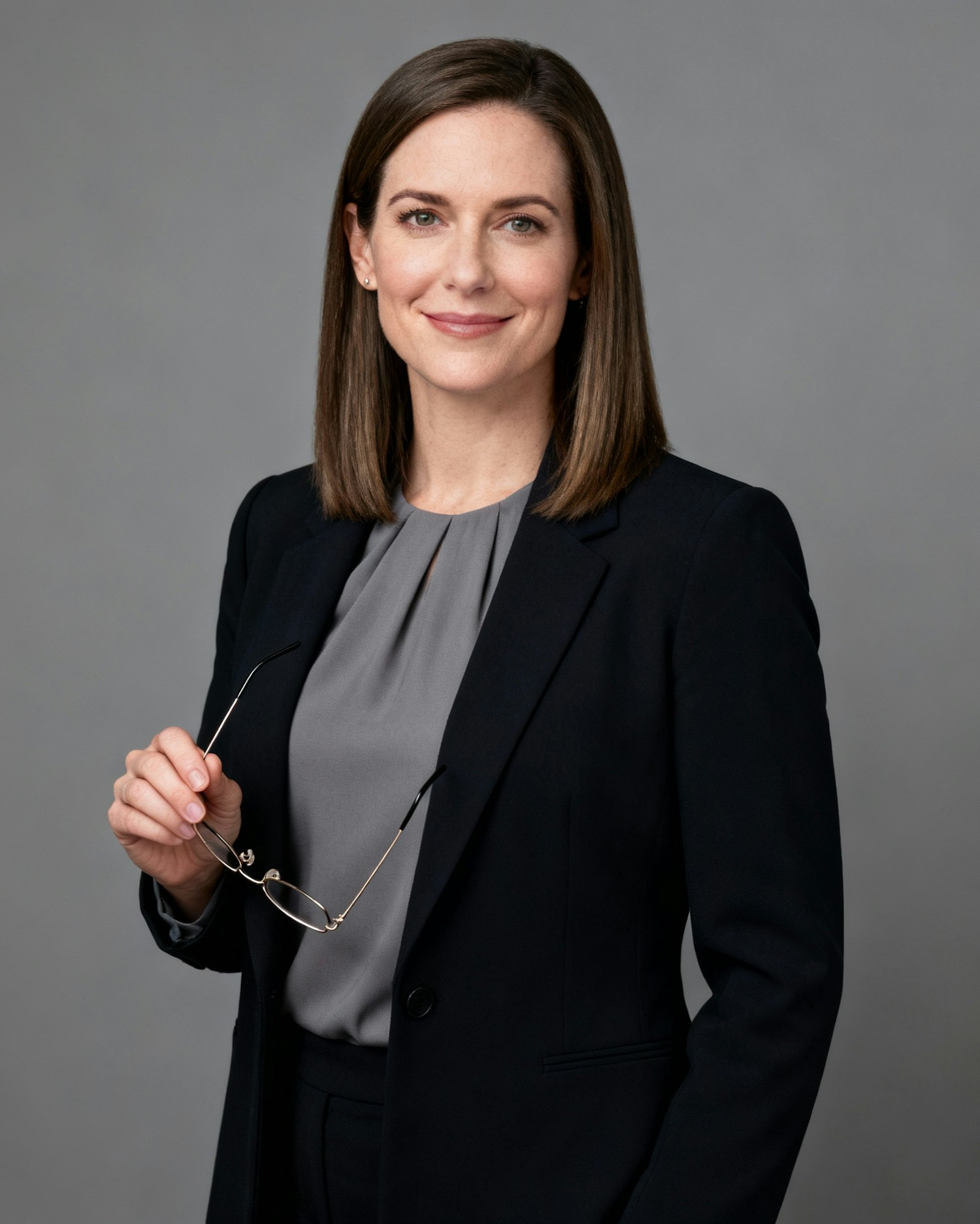 Studio portrait of an American woman corporate lawyer, age 32; fair skin, cool undertone; shoulder-length straight hair; charcoal blazer over a dove-gray blouse (non-branded); slim thin-rim glasses in hand; neutral mid-gray seamless backdrop; clamshell soft key with gentle rim at 5500K; 105mm macro-sharp; photorealistic, editorial. Expression: calm confidence with a subtle half-smile. Skin: natural, lightly smoothed—texture retained. Negative: over-retouch, logos, watermarks, harsh shadows.