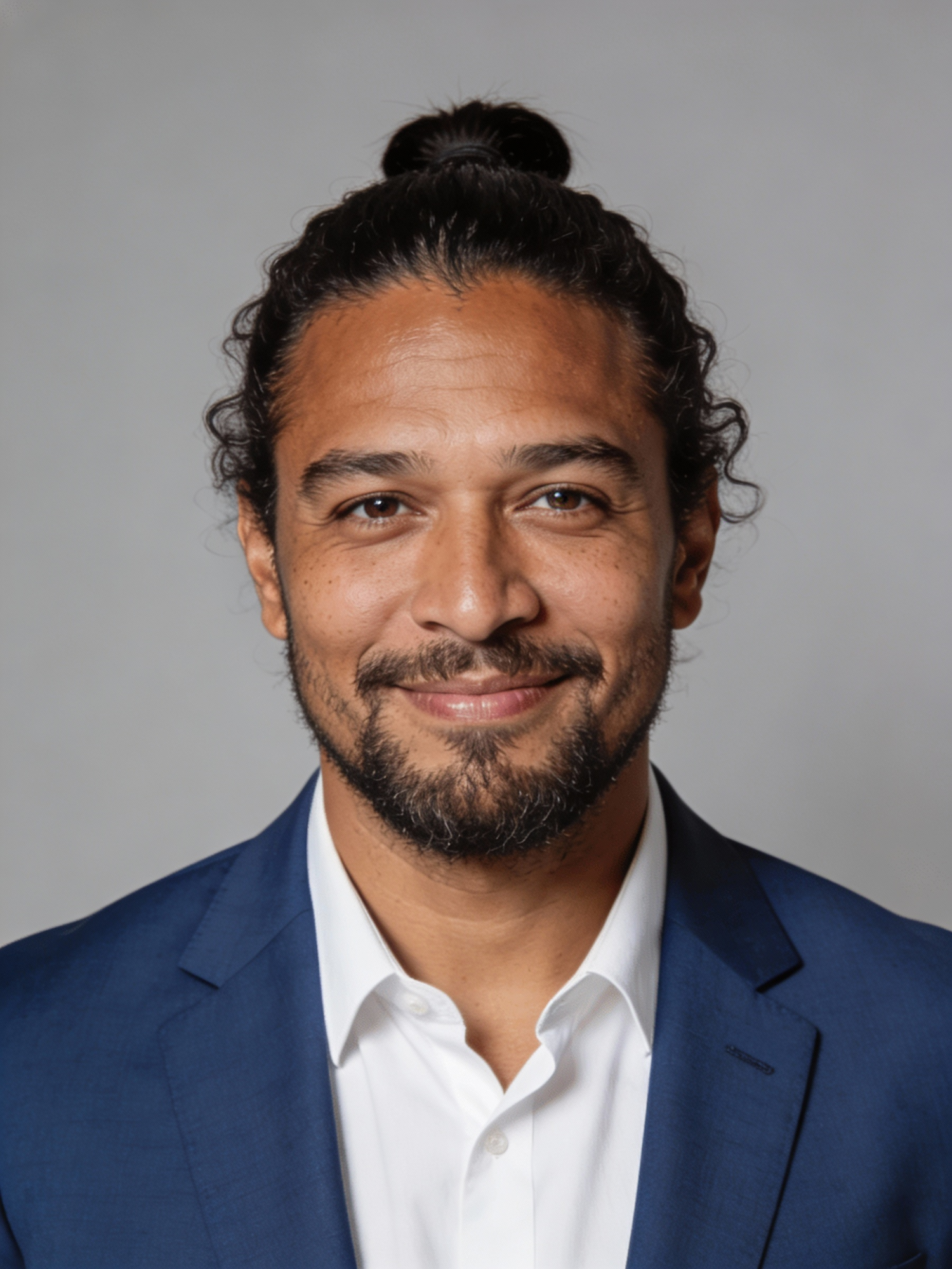 A man with a bun and beard in a blue suit and white shirt smiles warmly against a neutral gray background.