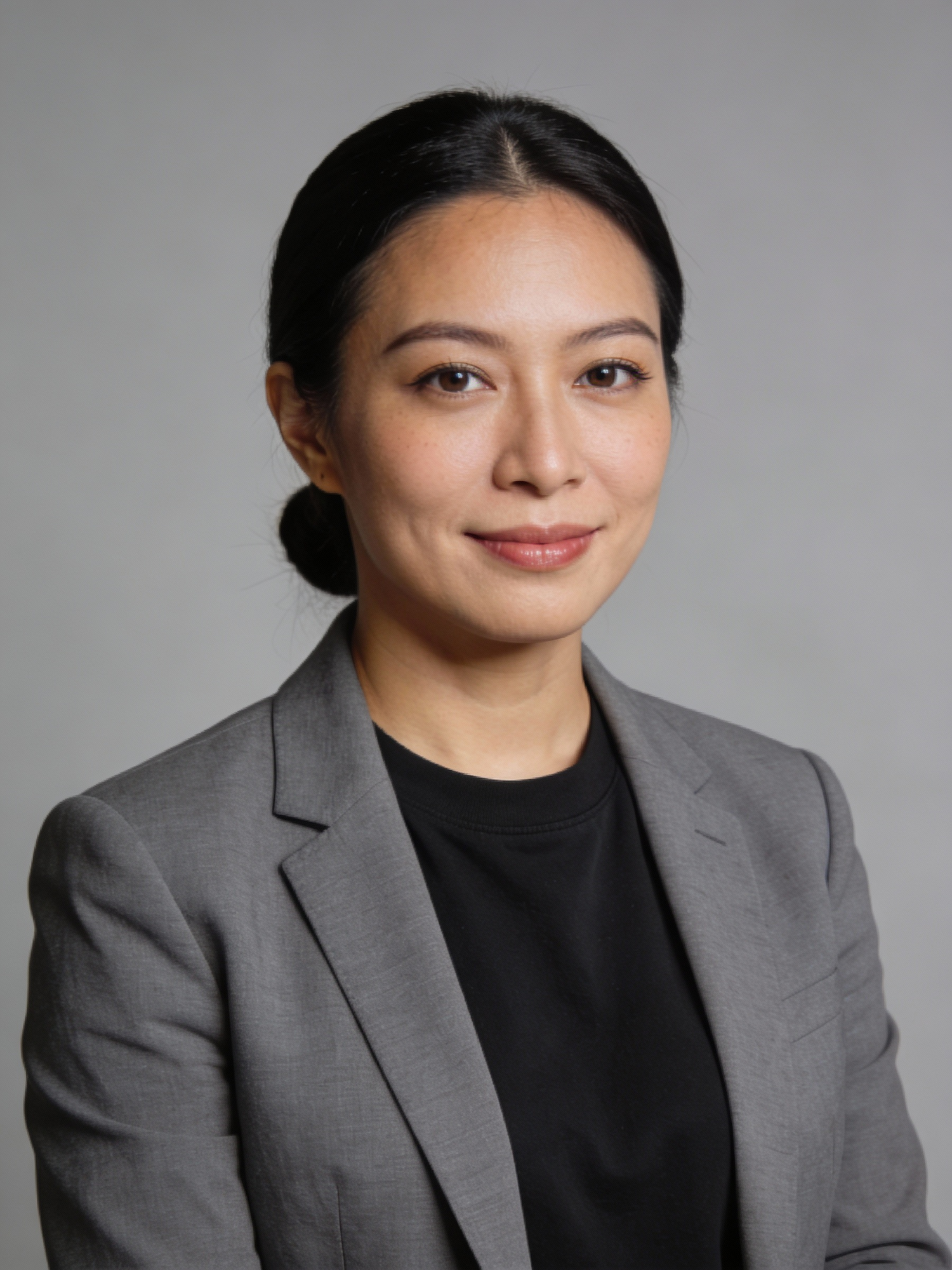 Studio portrait of a Hmong female Operations Lead from Southeast Asia, age 34; light-medium skin, neutral undertone; long black hair tied into a neat low bun; soft natural makeup, gentle eyeliner; medium-gray blazer over a black crewneck top; neutral mid-gray seamless backdrop; Rembrandt lighting with soft fill; 105 mm macro-sharp. Expression: composed and focused, minimal closed-mouth smile with attentive gaze. Framing: portrait orientation, 3:4 ratio; mid-chest-up composition. Subject centered, camera at eye level, facing directly toward the camera. Full head and hair fully inside the frame with a little space above; both shoulders visible, no cropping at top or sides. Neutral studio composition, no props.