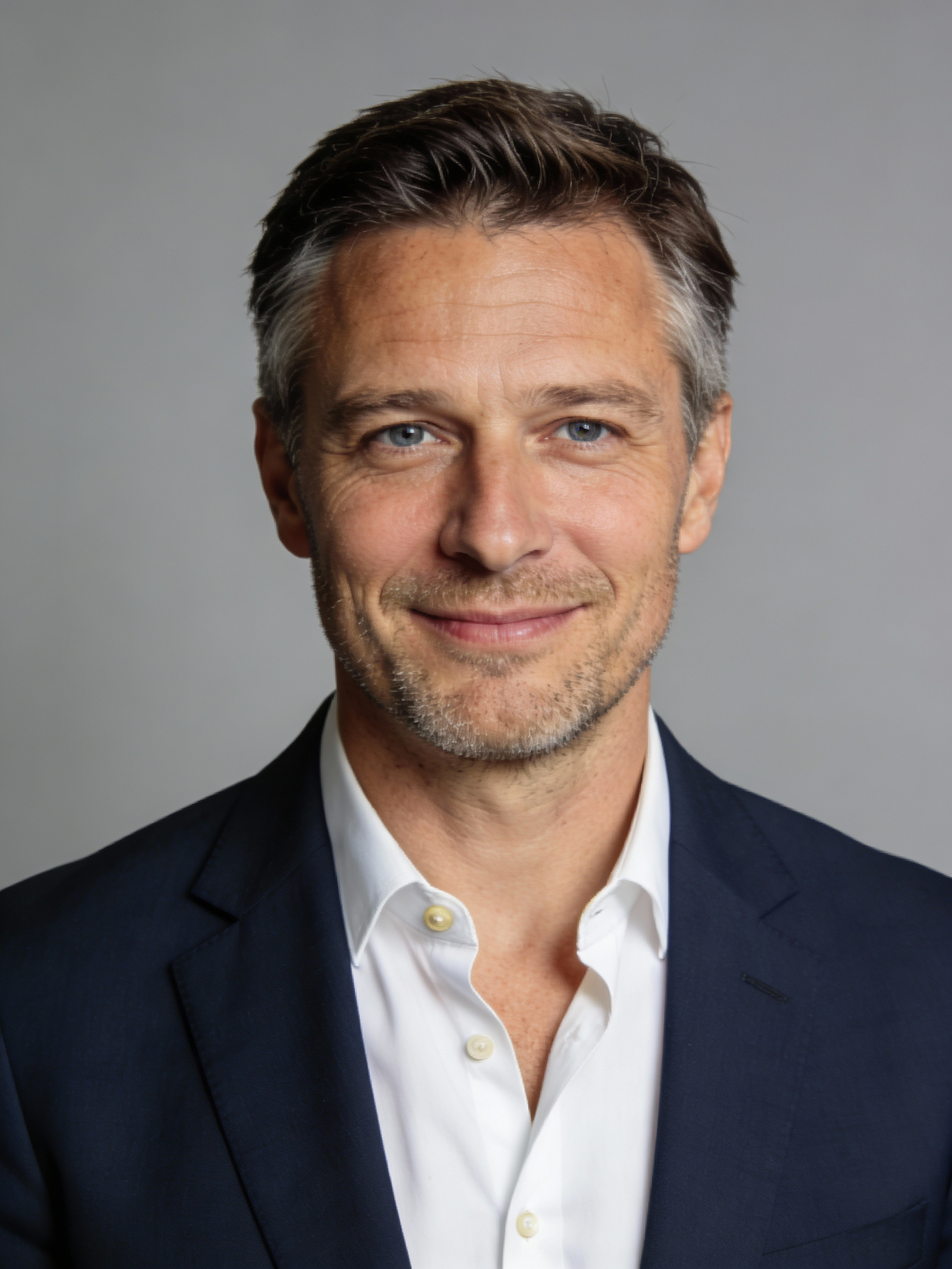 Studio portrait of a German male CEO, age 45; fair skin, neutral undertone; short dark brown hair with a few gray strands at the temples, neatly styled; light stubble beard; navy tailored suit jacket over a crisp white shirt, top button open, no tie; neutral mid-gray seamless backdrop; Rembrandt lighting with soft fill; 105 mm macro-sharp. Expression: confident and calm, soft closed-mouth smile. Framing: portrait orientation, 3:4 ratio; mid-chest-up composition. Subject centered in frame, camera at eye level, facing directly toward the camera (front view). Full head and hair completely inside the frame with a little space above; both shoulders visible, no cropping at the top or sides. Neutral studio composition, no props.