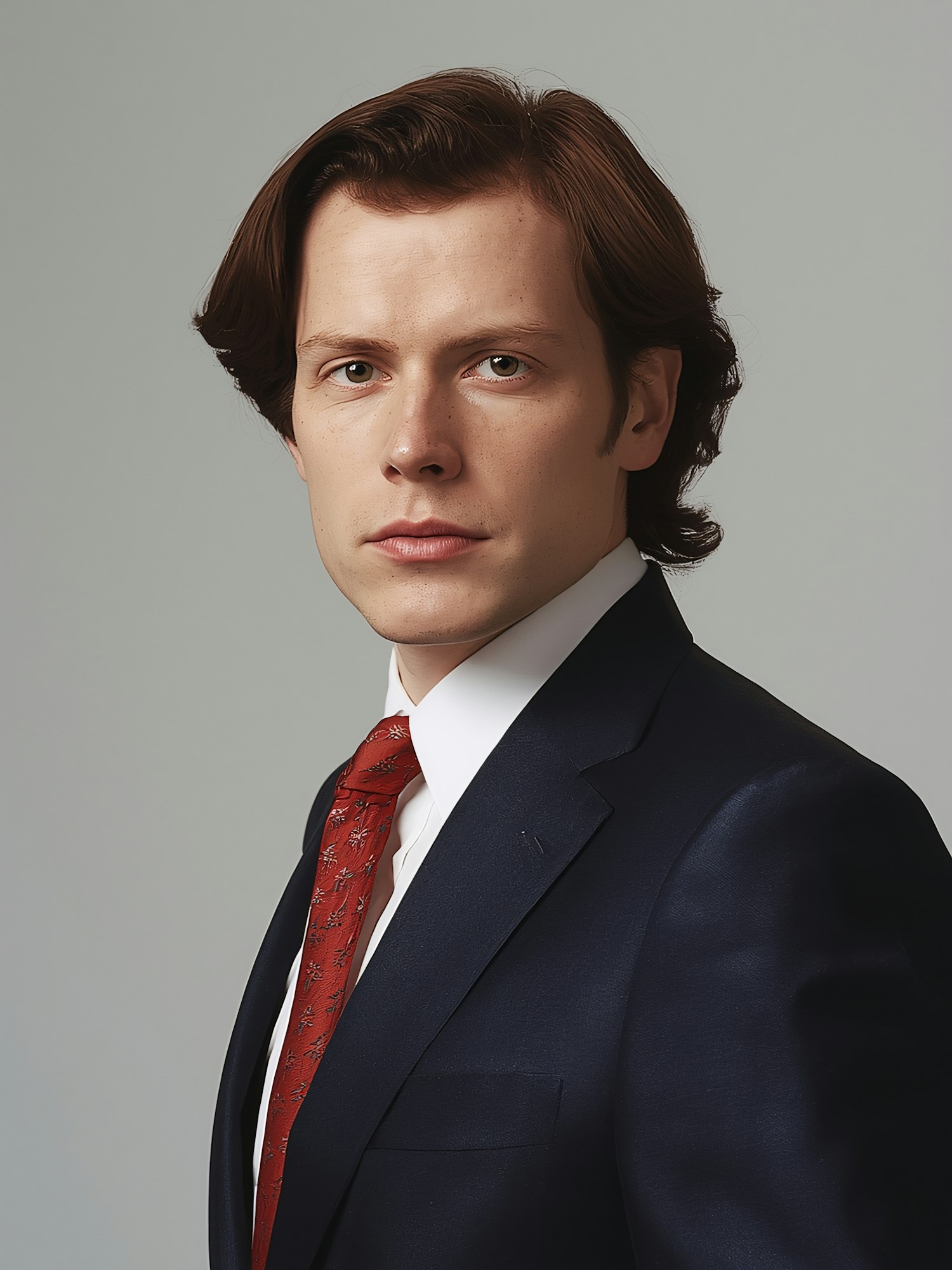Professional portrait of a man in a navy suit and red tie, set against a neutral gray background, showcasing a formal and composed look.