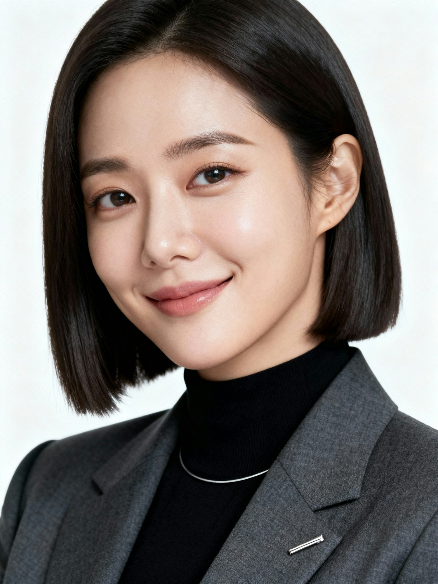 Studio portrait of a Korean woman cybersecurity analyst in her early thirties; fair skin (cool); straight bob; charcoal blazer over black mock-neck; thin silver lapel pin. Composition: three-quarter head-and-shoulders (~10° off-axis), eyes to camera; tight head-and-shoulders crop. Backdrop: pure white seamless. Lighting: bright high-key with soft Rembrandt shaping; even key + gentle fill to preserve skin texture; catchlights clean. Optics: 105 mm macro-sharp; photorealistic, editorial; exposure matched across set; neutral white balance. Expression: focused half-smile. Negative: youthifying blur, neon hacker overlays, color cast, vignetting, backdrop banding, heavy glam retouch.