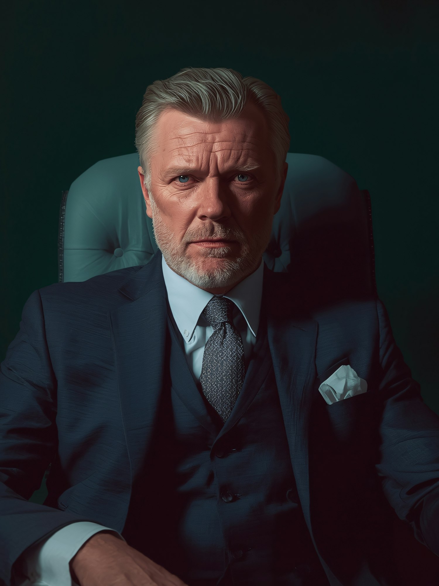 A distinguished man in a dark suit sits in a leather chair, exuding professionalism and focus against a dark background.