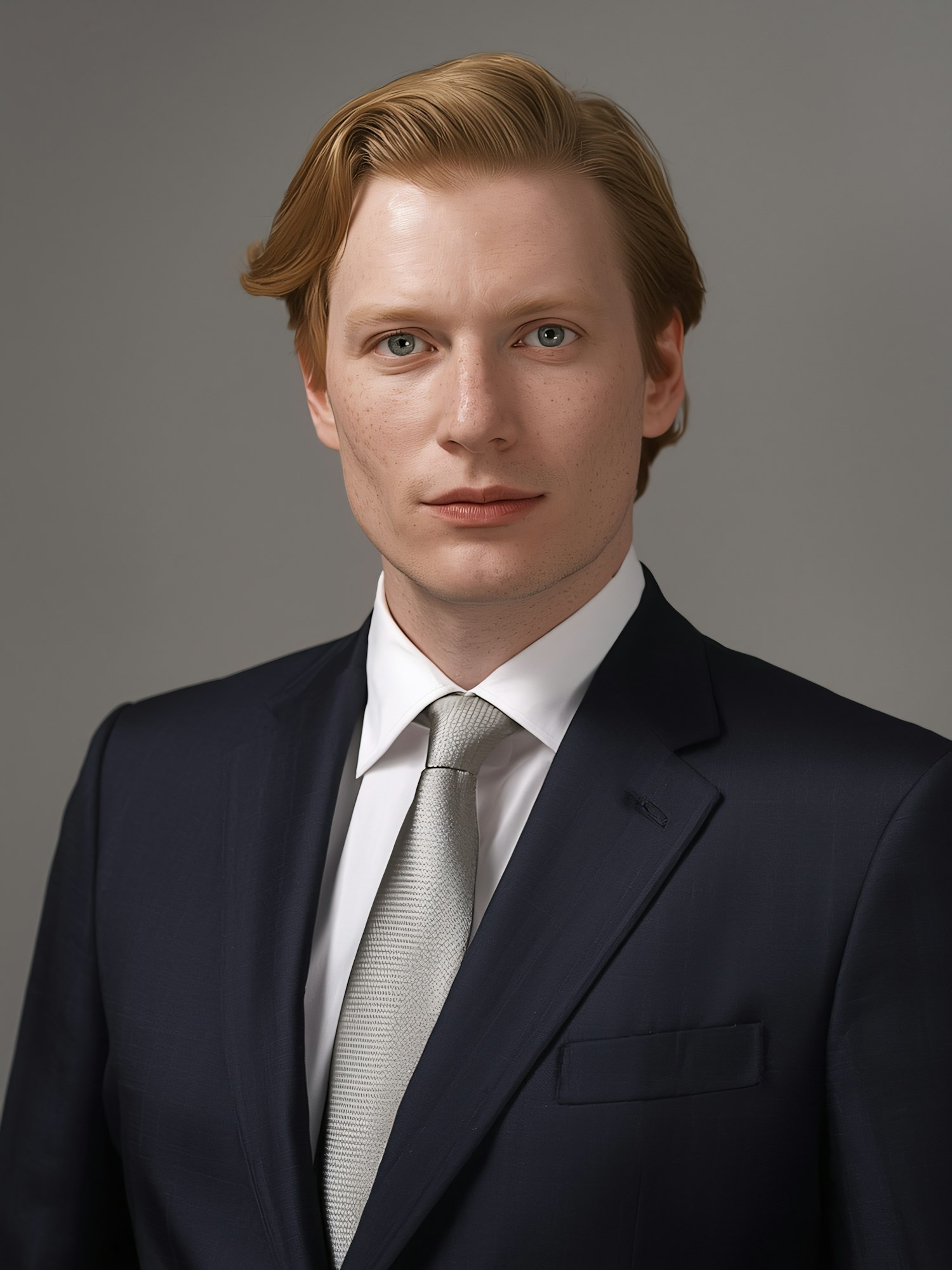 Professional portrait of a man in a navy suit, white shirt, and silver tie, set against a neutral gray background.