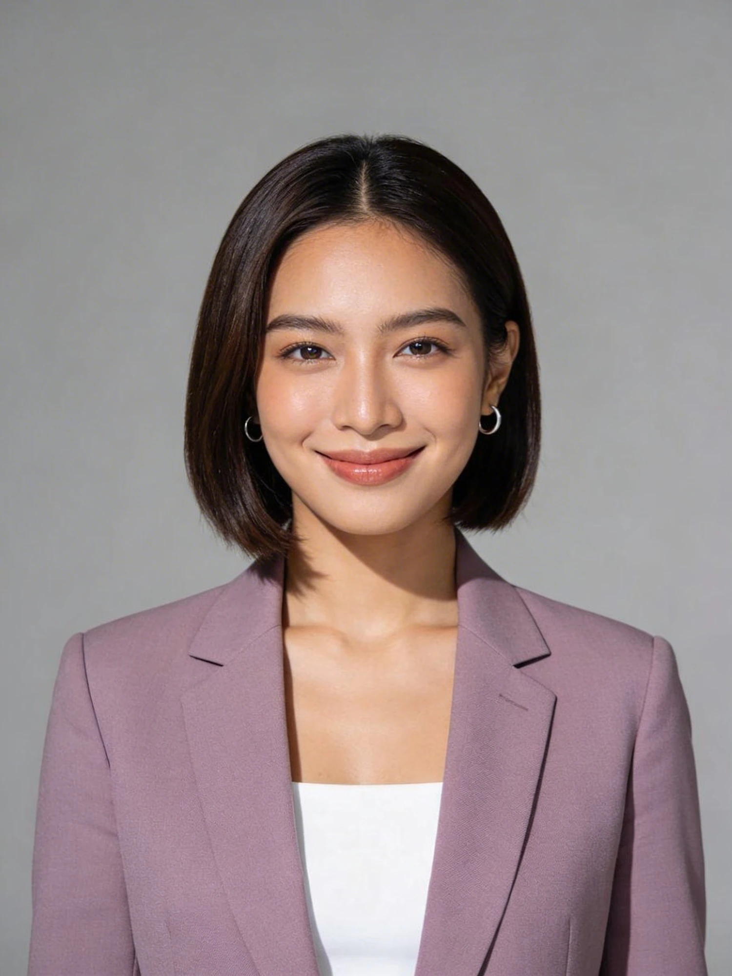 Studio portrait of a Thai female, age 28; light-medium skin with neutral undertone; sleek dark brown bob cut just below the chin; soft radiant makeup. Outfit: muted lavender tailored blazer worn over a white square-neck top, no logos. Jewelry: small silver hoop earrings. Neutral mid-gray seamless backdrop; Rembrandt lighting with soft fill; 105 mm macro-sharp. Expression: confident and approachable, gentle closed-mouth smile, direct eye contact. Framing: 3:4 portrait, mid-chest-up, centered, eye level, front view; same distance to camera; full head inside; shoulders visible. No props, no logos.