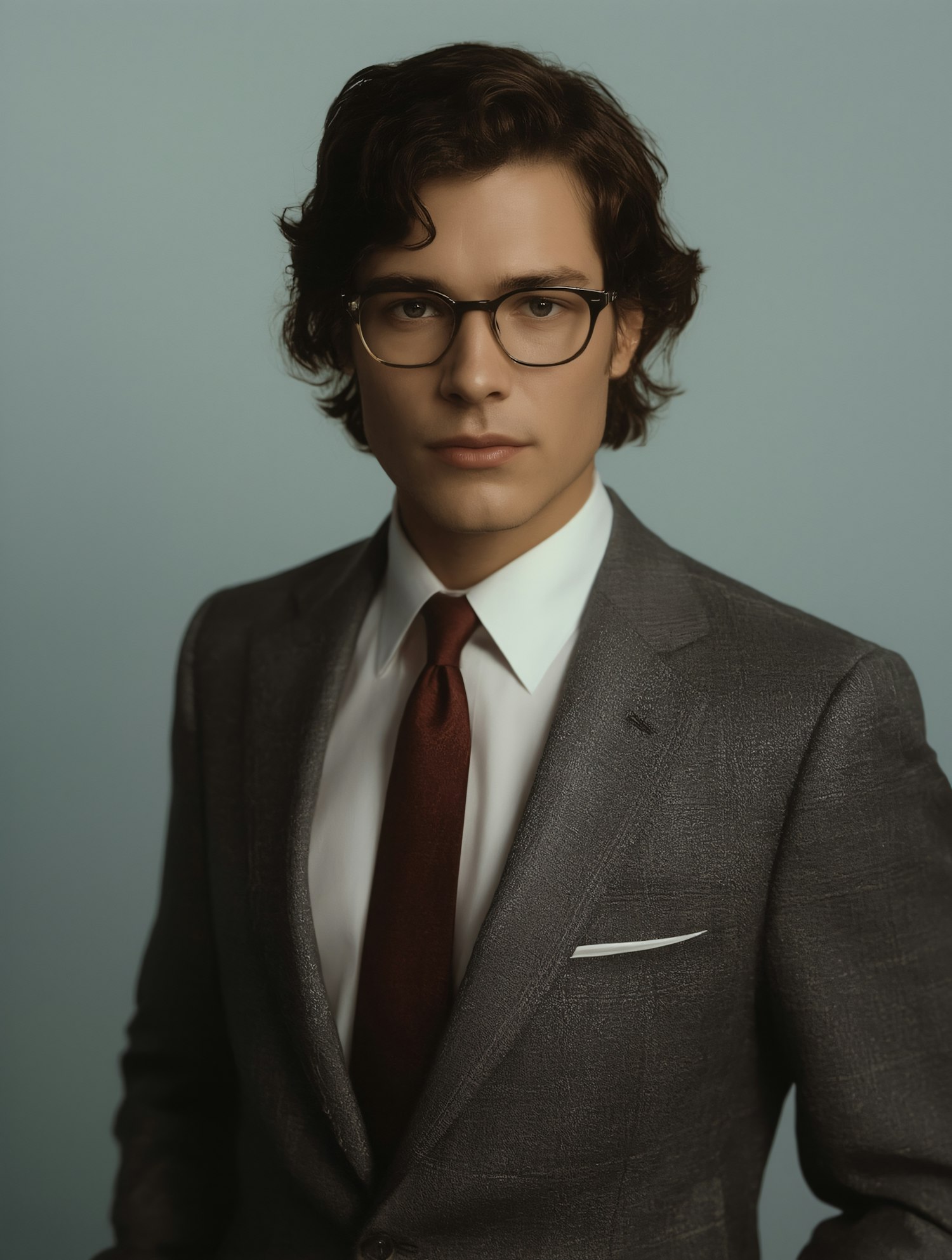 Young man in a gray suit and red tie, wearing glasses, against a light blue background. Professional and polished look.