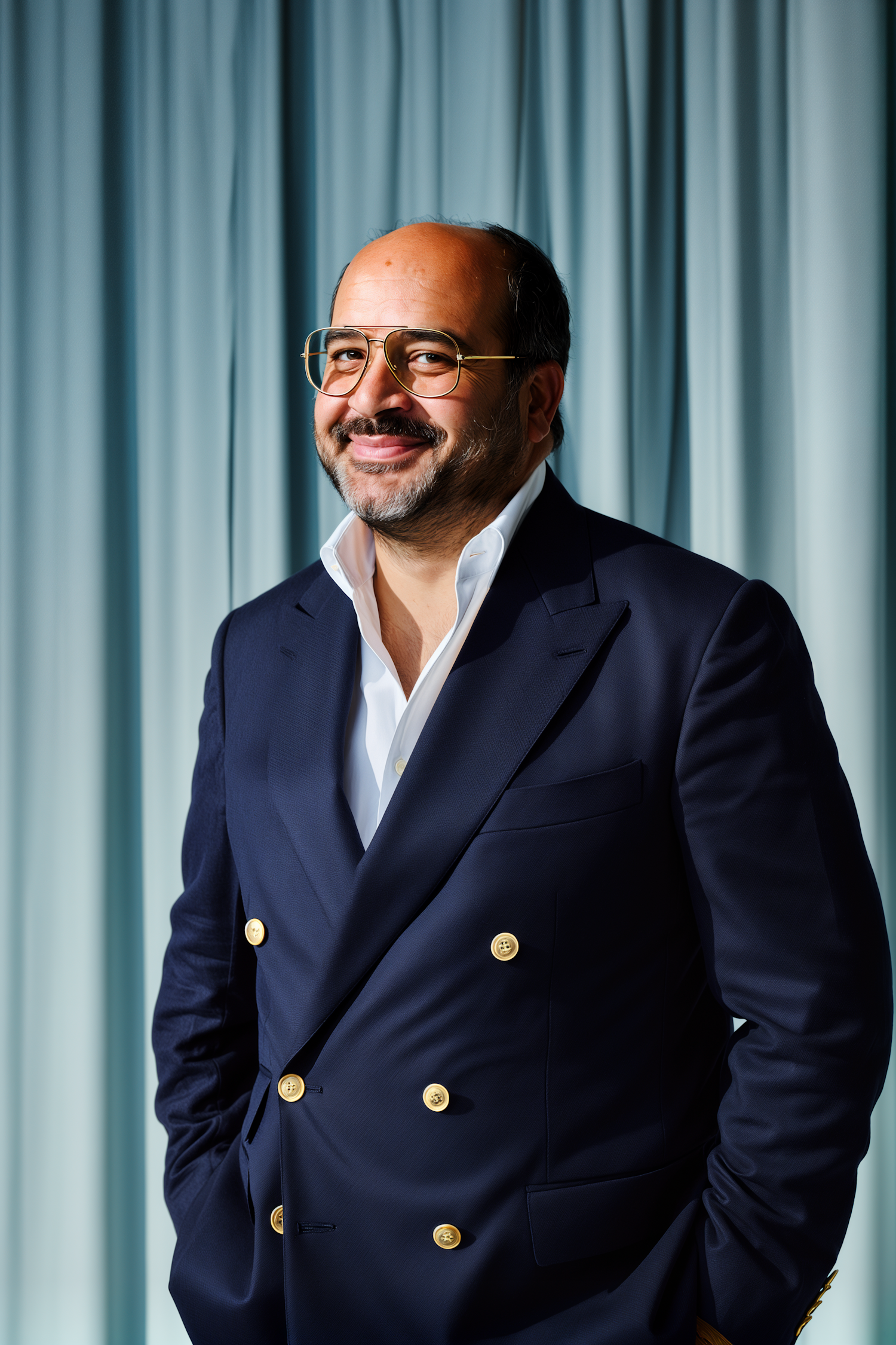 A man in a navy blazer with gold buttons and glasses smiles warmly against a light blue curtain backdrop.