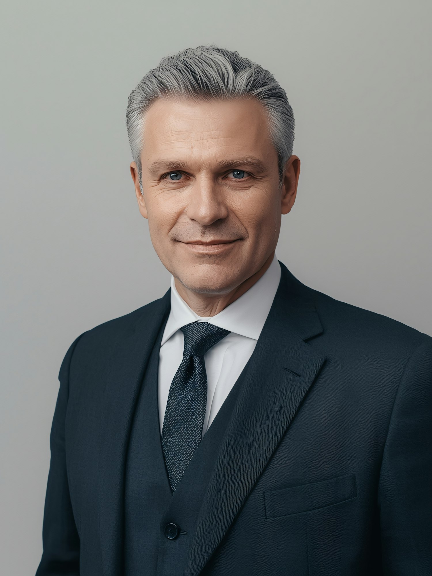 Professional portrait of a middle-aged man in a navy suit and tie, with gray hair and blue eyes, set against a neutral background.