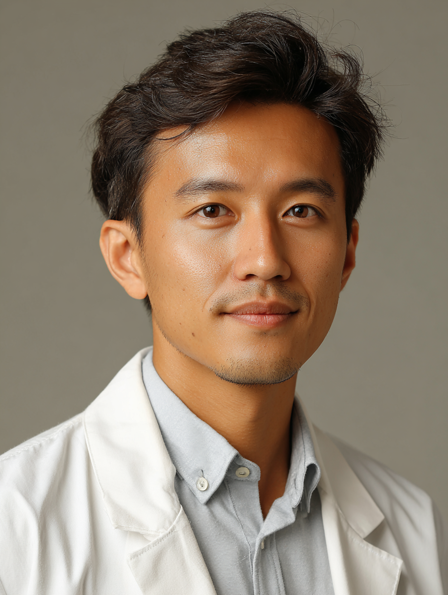 Portrait of a man in a white coat and light blue shirt, with a neutral gray background and soft lighting.