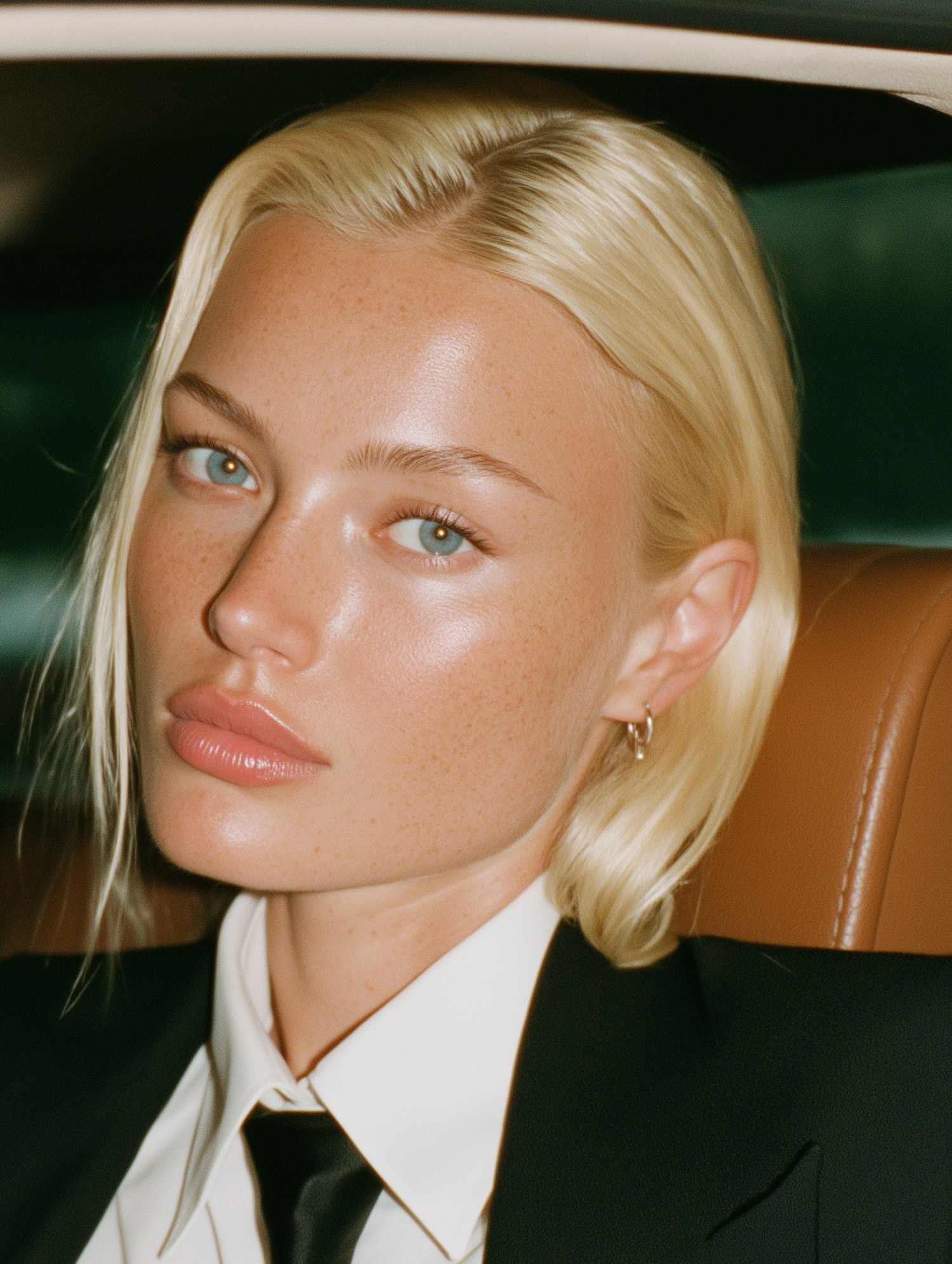 Close-up portrait of a person with blonde hair and blue eyes, dressed in formal attire, seated in a vehicle with a leather interior.