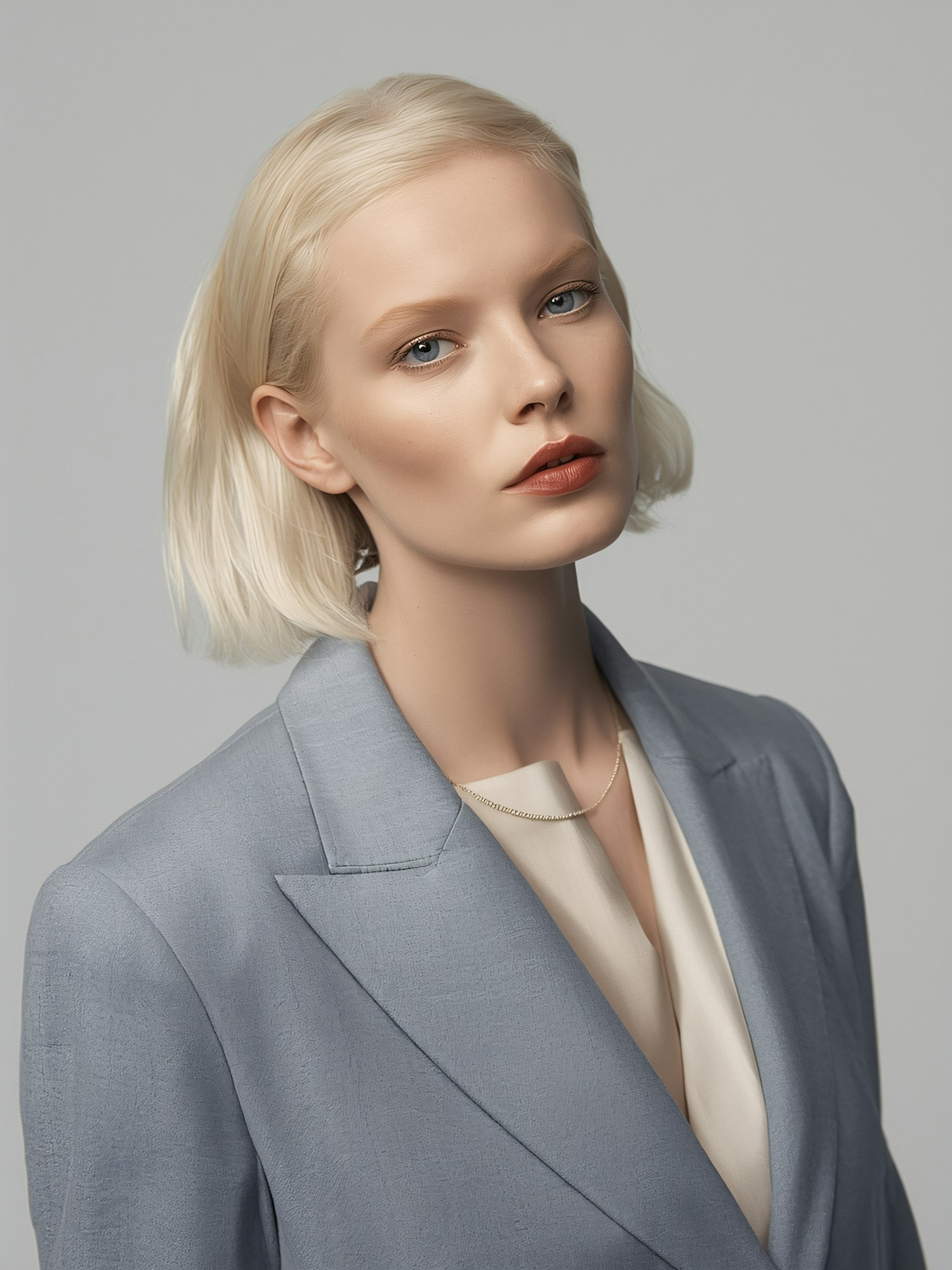 A professional portrait of a woman in a light blue blazer and cream blouse, with blonde hair and a sleek, polished appearance.