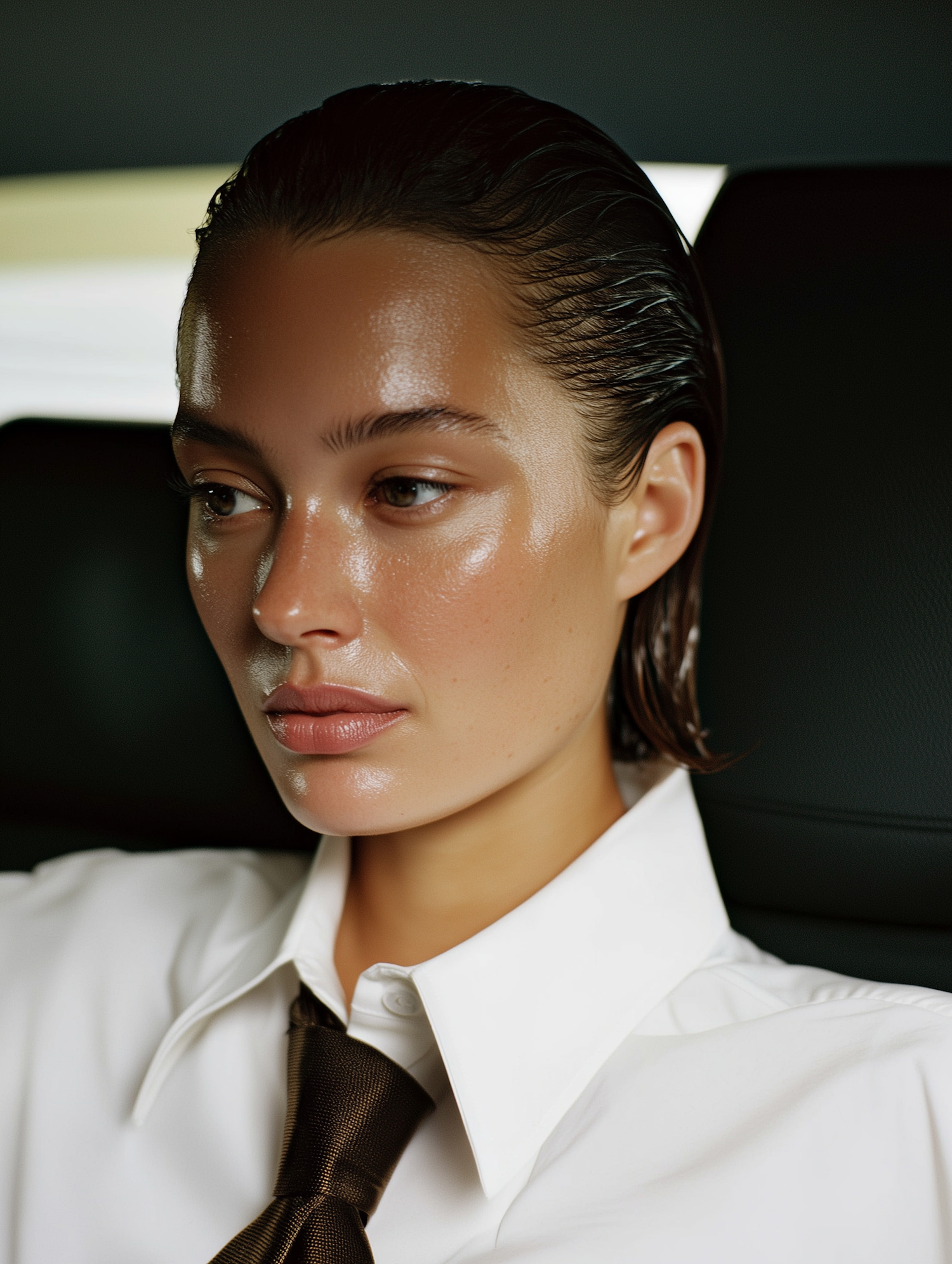 A person with slicked-back hair in a white shirt and tie, seated in a dimly lit setting, exuding a polished and professional vibe.