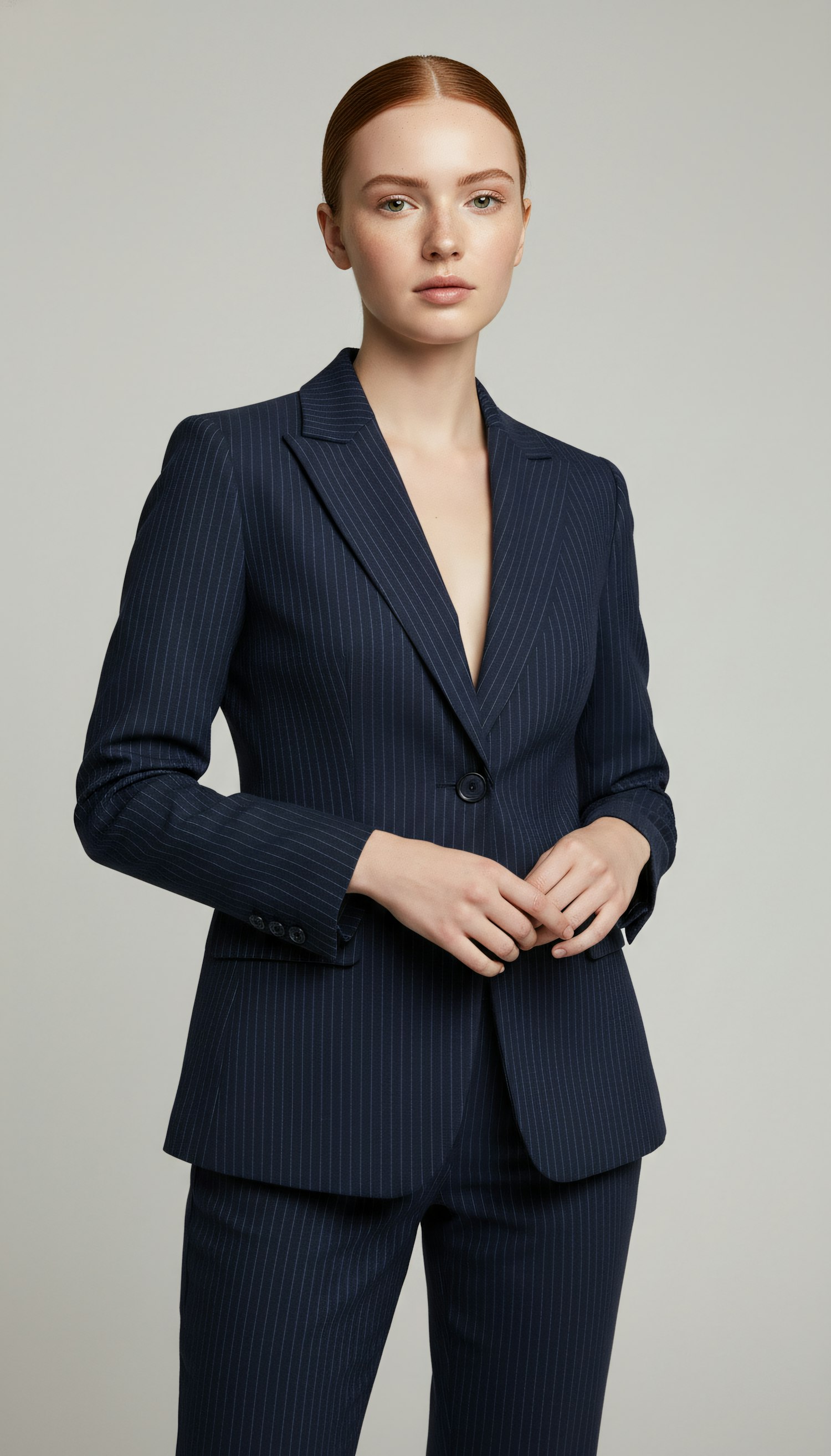 A person in a navy pinstripe suit with a composed expression, showcasing professional attire against a neutral background.