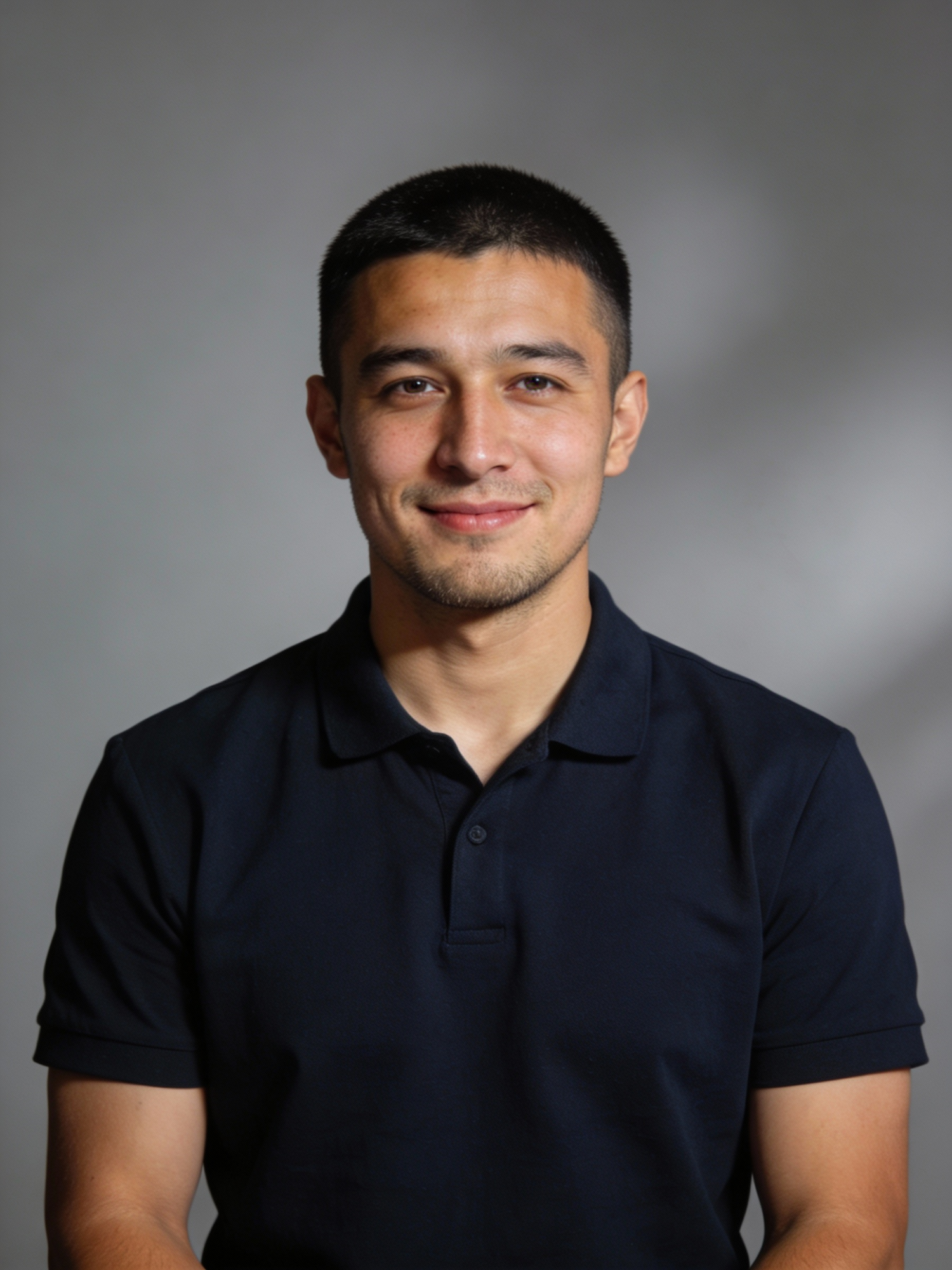 Studio portrait of a Kyrgyz male in his early 30s; light-medium skin, neutral undertone; short black hair, neatly cropped; light stubble; dark navy short-sleeve polo shirt, no logos; neutral mid-gray seamless backdrop; Rembrandt lighting with soft fill; 105 mm macro-sharp. Expression: relaxed and friendly, small half-smile. Framing: portrait orientation, 3:4 ratio; mid-chest-up composition. Subject centered, camera at eye level, facing the camera directly; full head and hair fully inside the frame with a little space above; both shoulders visible.