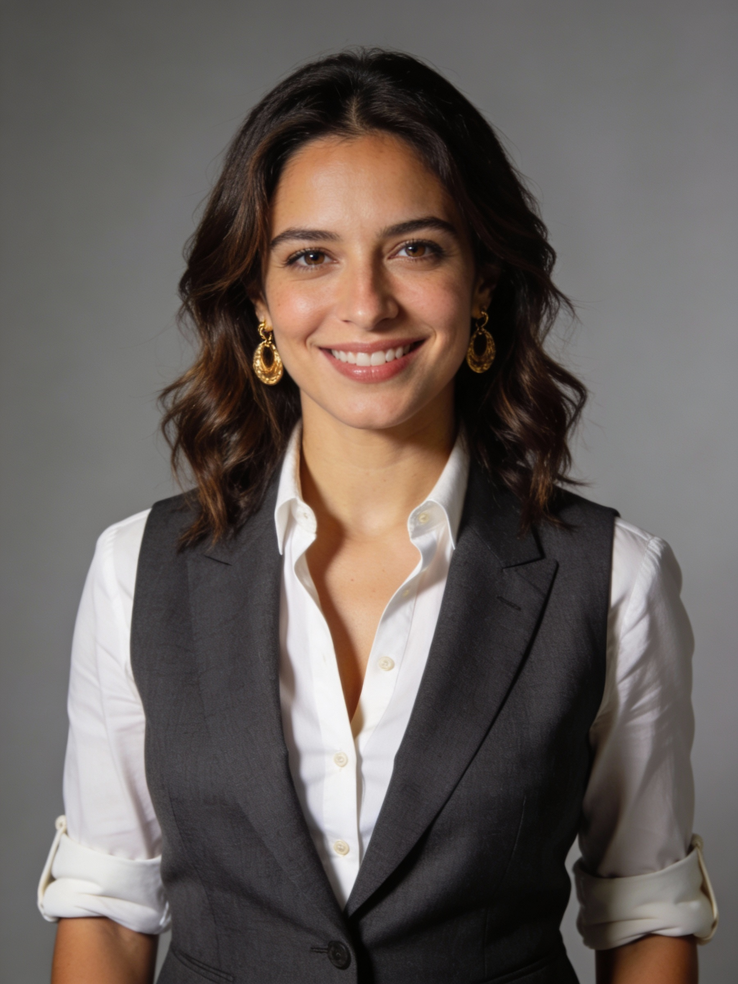 Studio portrait of a Chilean female, age 30; medium-light skin with neutral undertone; soft brunette waves with subtle volume. Outfit: tailored charcoal waistcoat layered over a crisp white button-up shirt (collar open, sleeves implied rolled), modern editorial business styling. Jewelry: statement gold earrings (balanced, not oversized). Neutral mid-gray seamless backdrop; Rembrandt lighting with soft fill; 105 mm macro-sharp. Expression: warm, confident smile with direct eye contact. Framing: portrait orientation, 3:4 ratio; mid-chest-up composition. Subject centered, camera at eye level. No props, no logos.