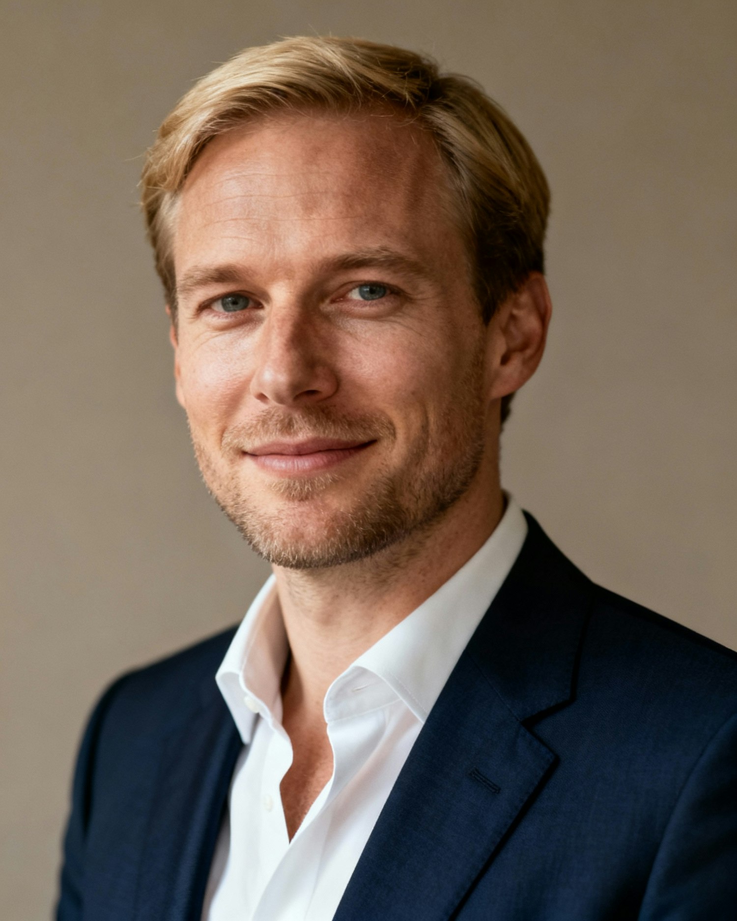 Professional portrait of a man in a dark blue suit and white shirt, with blonde hair and a short beard, against a neutral background.