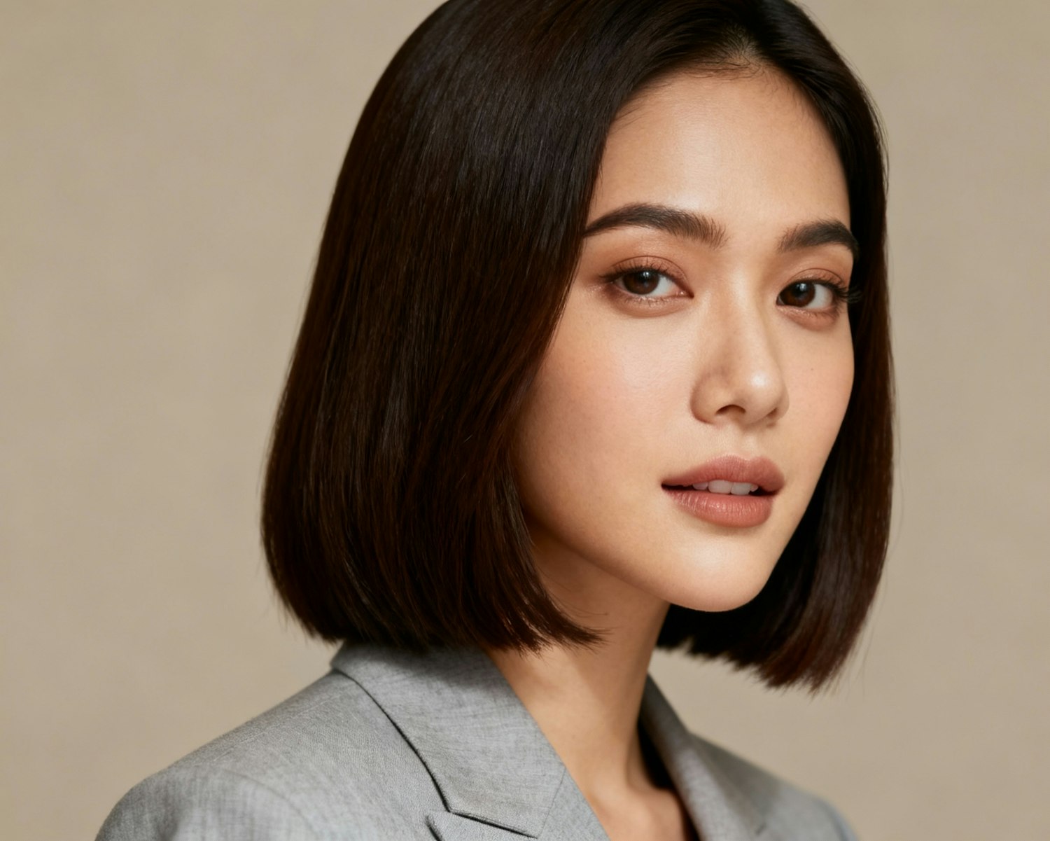 Studio professional portrait of a Vietnamese woman product designer, late-20s; light ivory skin (warm undertone), sleek dark brown bob; light gray blazer; expression: warm professionalism; neutral seamless backdrop, Rembrandt lighting; 105mm, f/2.8, ISO 100, RAW; photorealistic, editorial, macro-sharp, tack-sharp eyes; deliver 4:5 headshot and 3:4 half-body. Negative: (same).