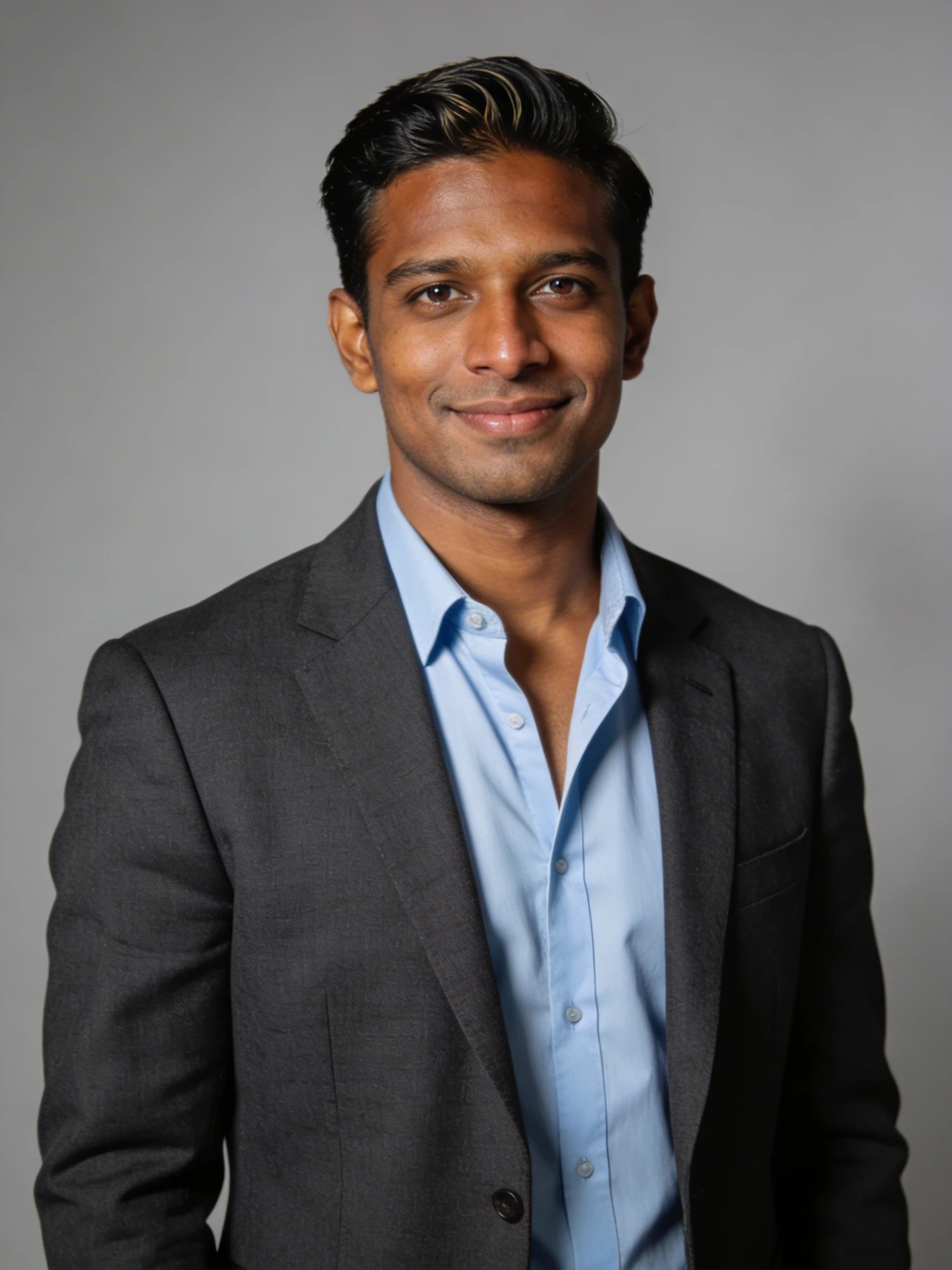 Studio portrait of a Sri Lankan male, age 32; medium brown skin with golden undertone; short black hair, neatly combed with subtle texture; clean-shaven face. Outfit: charcoal tailored blazer worn over a crisp pale blue open-collar shirt, no logos. Neutral mid-gray seamless backdrop; Rembrandt lighting with soft fill; 105 mm macro-sharp. Expression: confident and approachable, subtle closed-mouth smile, direct eye contact. Framing: 3:4 portrait, mid-chest-up, centered, eye level, front view; same distance to camera; full head inside; shoulders visible. No props, no logos.