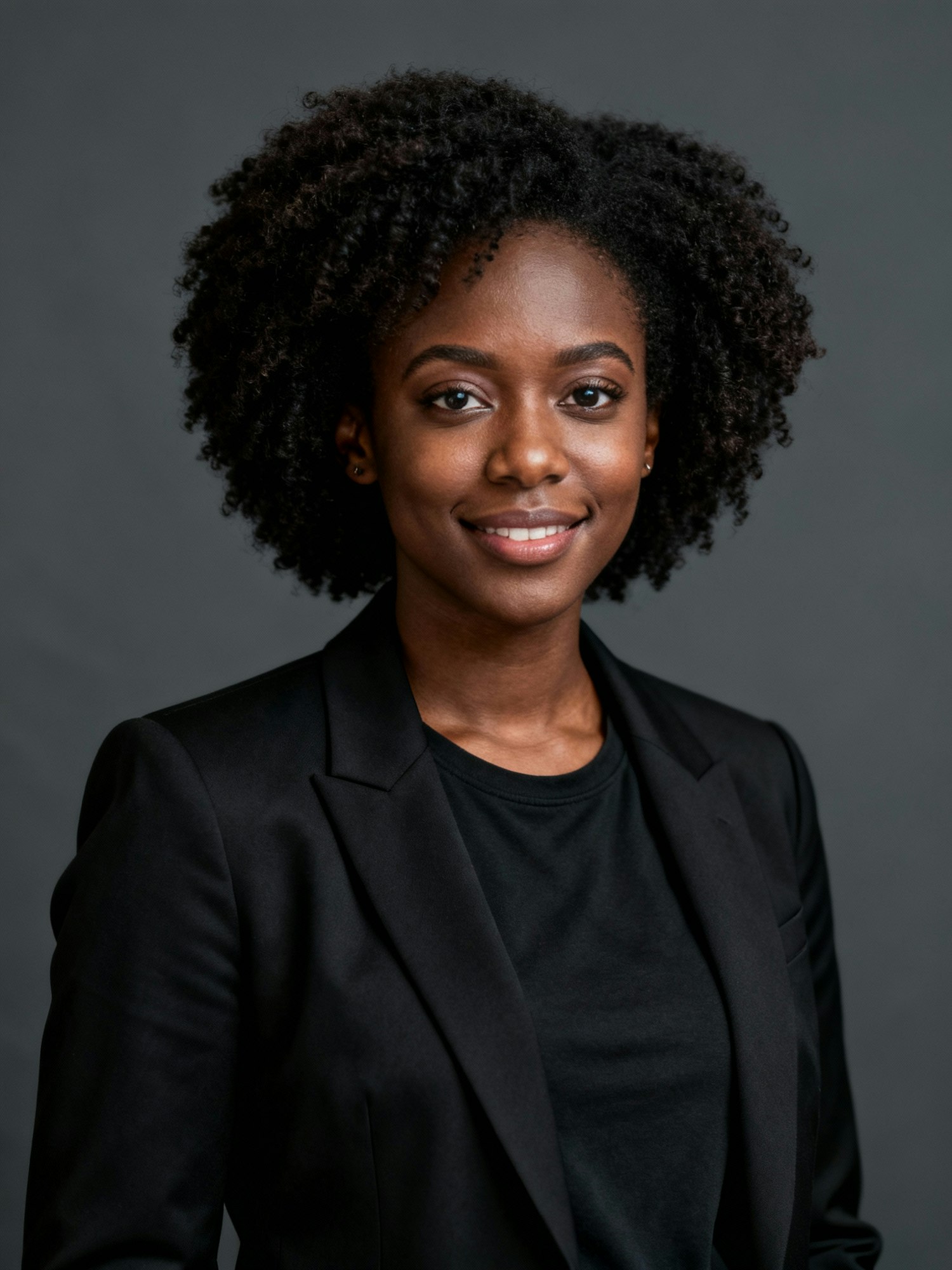 studio portrait of a black woman cybersecurity lead with 4c afro texture hair; matte black blazer, simple tee; dark gray seamless backdrop; clamshell lighting; 85mm; photorealistic, clean shadows, true to tone rendering. expression: determined, welcoming. negative: plastic skin, excessive retouching.