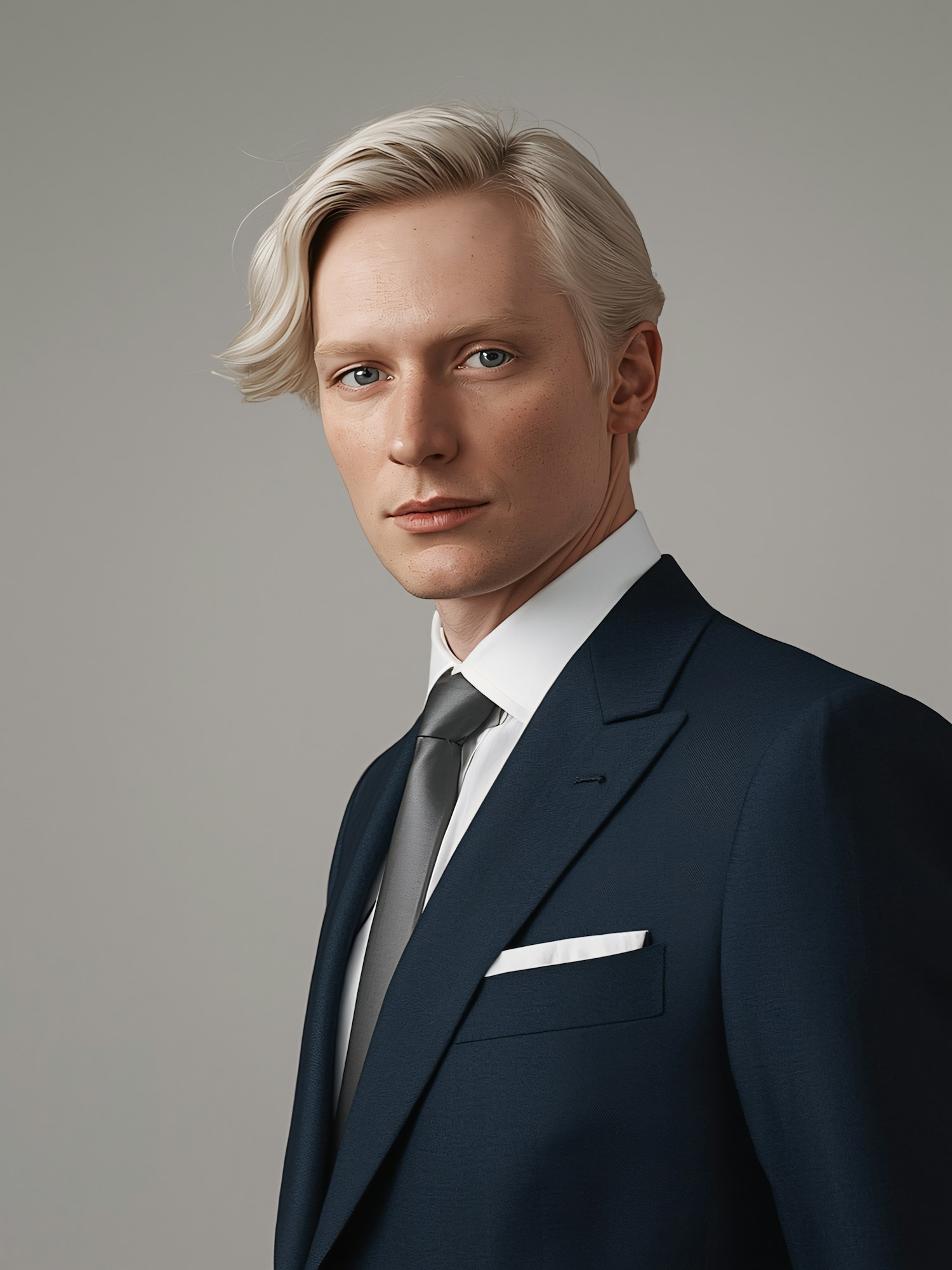 A professional portrait of a man in a navy suit with a gray tie, light blonde hair, and a composed expression against a neutral background.
