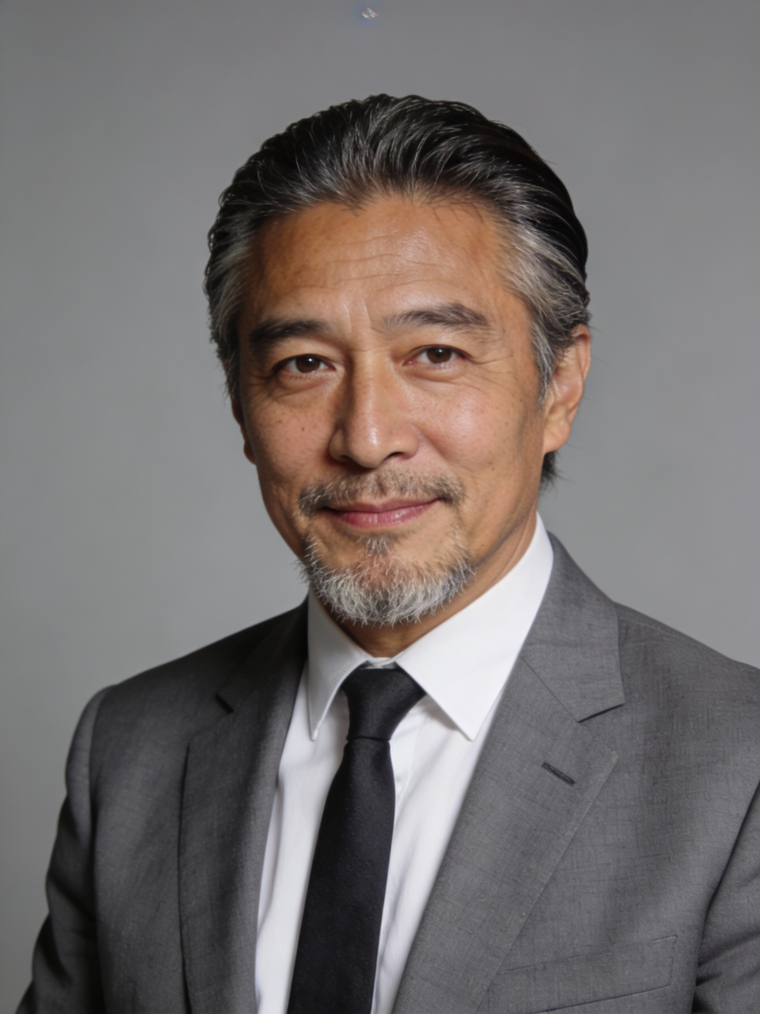 Professional portrait of a middle-aged man in a gray suit and black tie, with a neutral gray background and soft lighting.