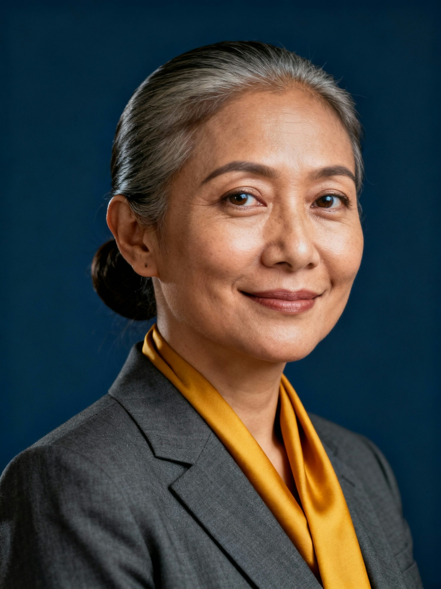 Studio portrait of a Bhutanese woman architect in her forties; light-medium skin, neutral-warm; sleek low bun; tailored charcoal blazer with a slim saffron silk neck scarf (non-branded); deep indigo seamless backdrop. Lighting: Rembrandt key at 5600 K + neutral white rim (5600 K) for clean separation; soft negative fill. Lens/Quality: 105 mm macro-sharp, eyes tack-sharp with natural catchlights; studio-grade clarity, fine skin texture retained—no plastic blur. Expression: calm authority, slight half-smile; three-quarter head turn, eyes to camera. Negative: over-retouch, harsh HDR, logos, watermarks, banding.