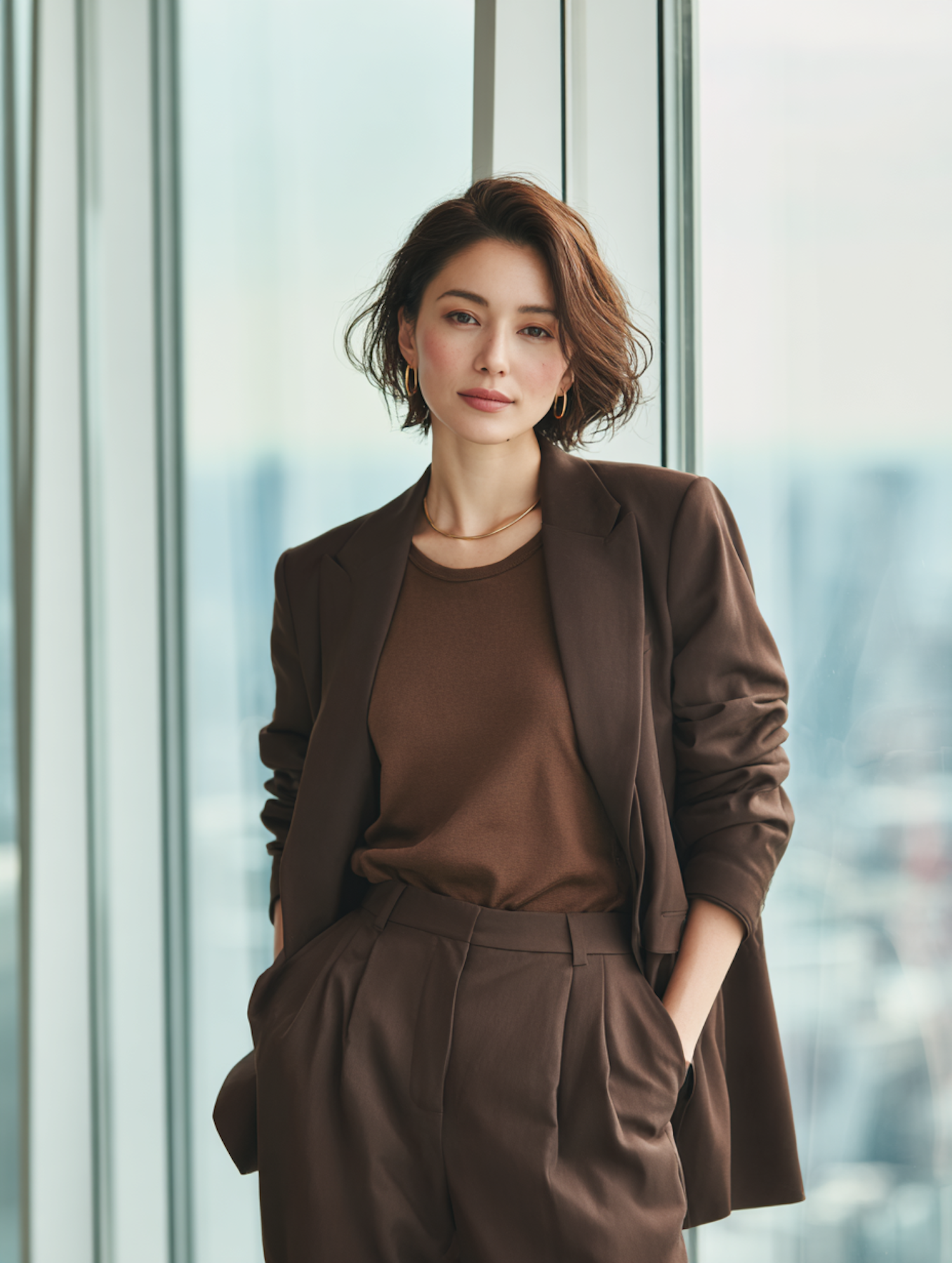 A stylish individual in a brown suit stands by a window with a city view, exuding a modern and professional vibe.