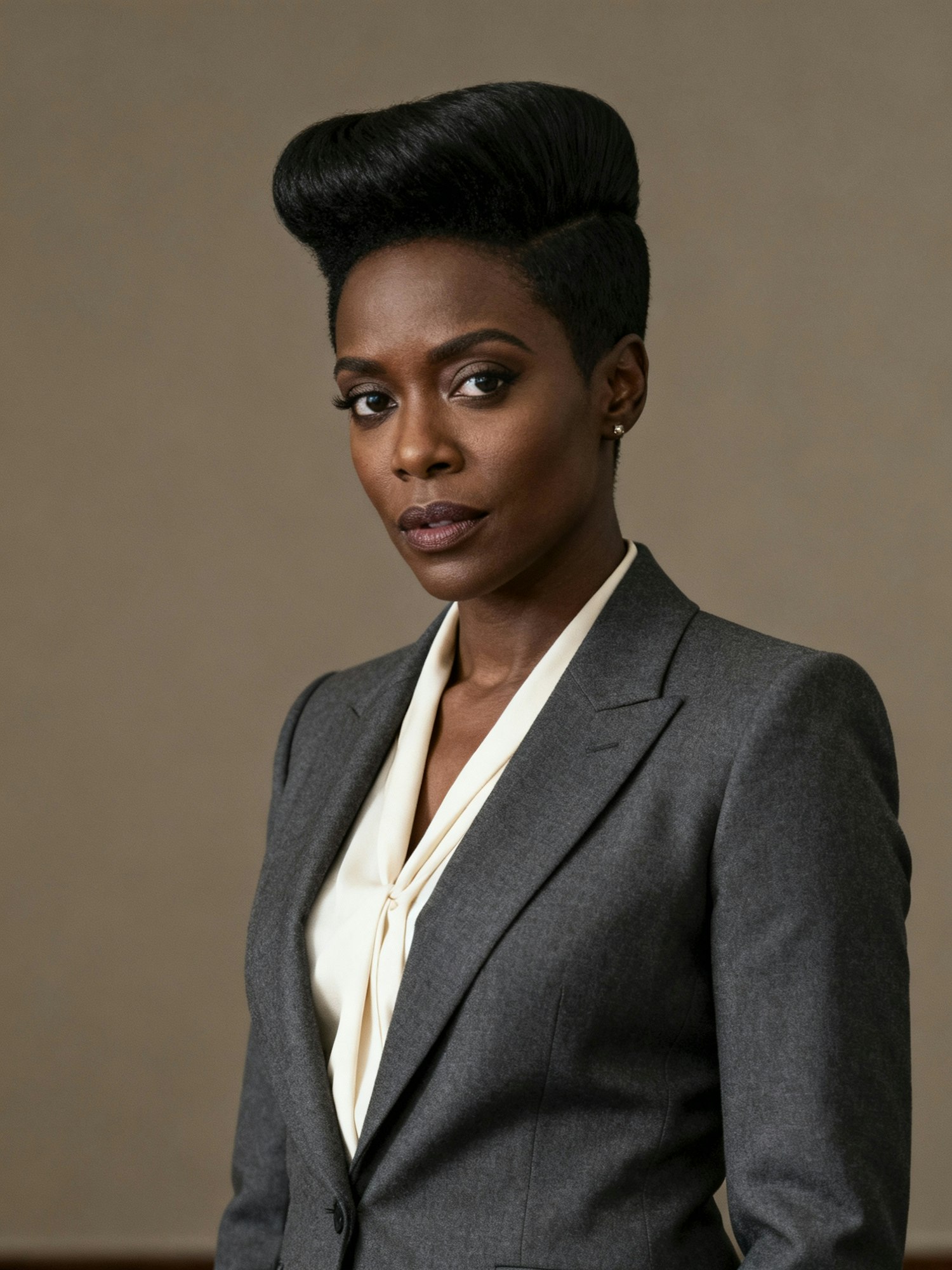 Cinematic portrait of a stylish Black female lawyer dressed in a tailored charcoal-gray suit with a cream blouse that flatters her skin tone. Her hair is styled in a trending short cut: a sleek tapered afro with a soft, sculpted silhouette that gives a modern, confident edge. She stands against a muted taupe background that enhances the outfit. Clean, diffused lighting brings out the texture of her hair, the sharp lines of the suit, and her poised, assertive expression. The mood is refined, contemporary, and undeniably commanding—high-fashion professionalism.