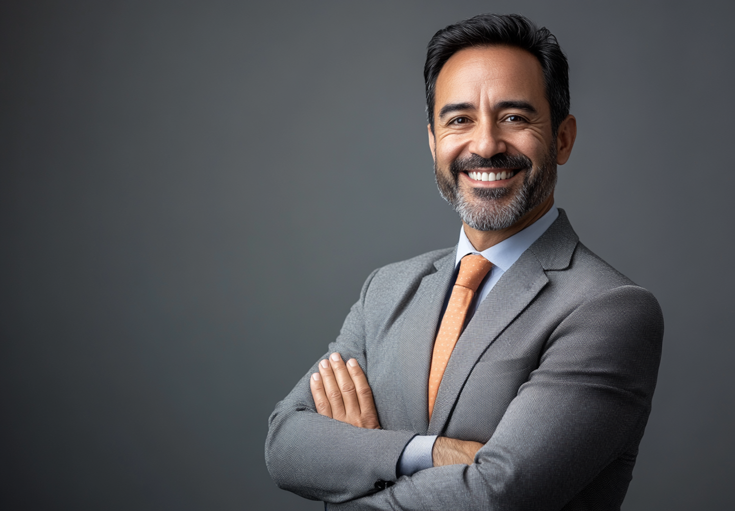 Confident middle-aged man in a gray suit with an orange tie, smiling warmly against a gray background.