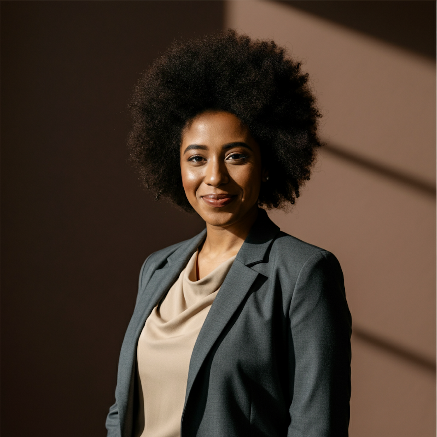 Confident Black woman with afro hairstyle in gray blazer, smiling warmly against a softly lit background.