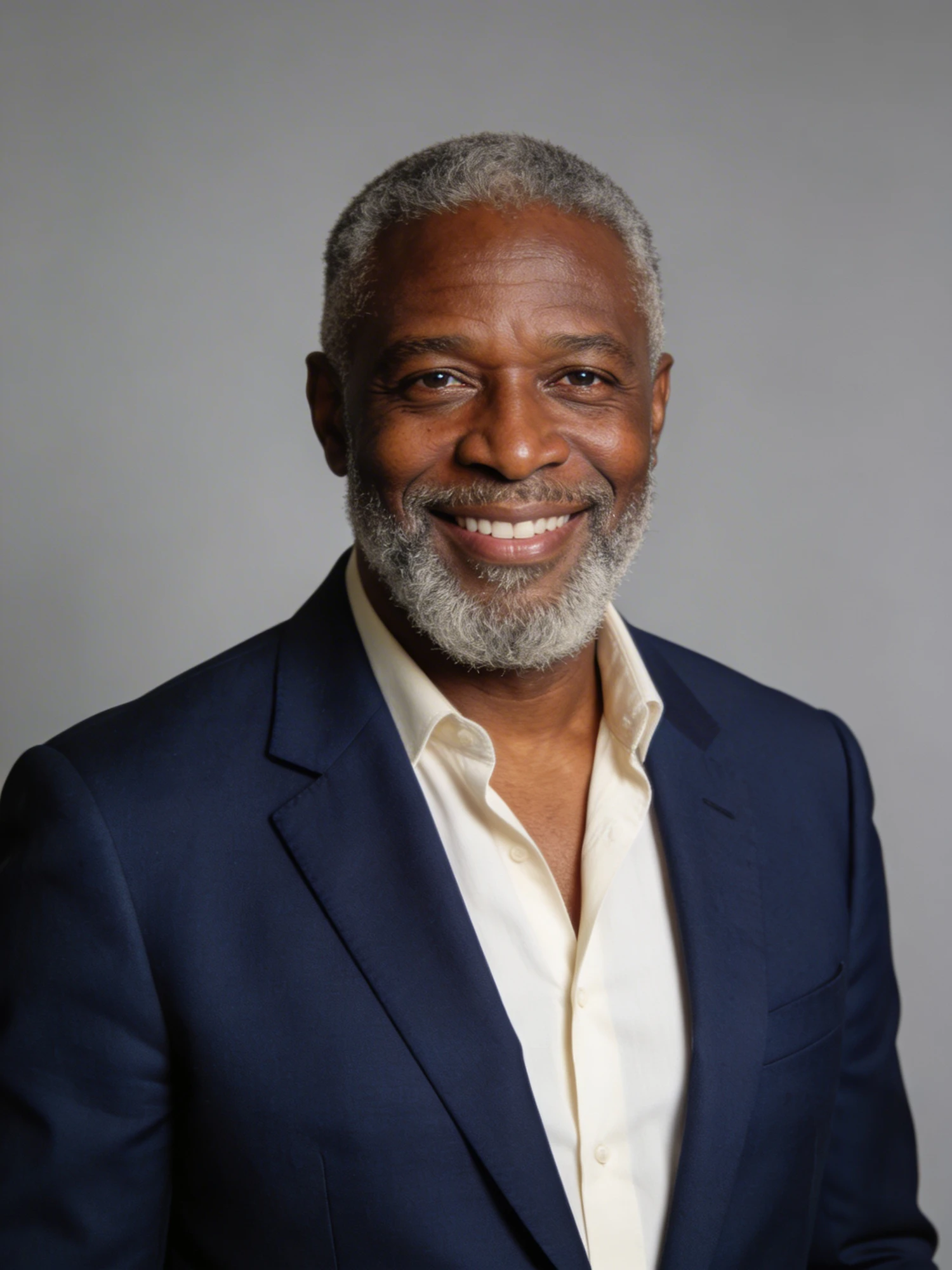 Studio portrait of a Nigerian male, age 55; deep brown skin with warm undertone; short gray hair, neatly shaped; full trimmed gray beard. Outfit: rich navy tailored blazer worn over a soft ivory open-collar shirt, no logos. Neutral mid-gray seamless backdrop; Rembrandt lighting with soft fill; 105 mm macro-sharp. Expression: confident and authoritative, warm executive smile, direct eye contact. Framing: 3:4 portrait, mid-chest-up, centered, eye level, front view; same distance to camera; full head inside; shoulders visible. No props, no logos.