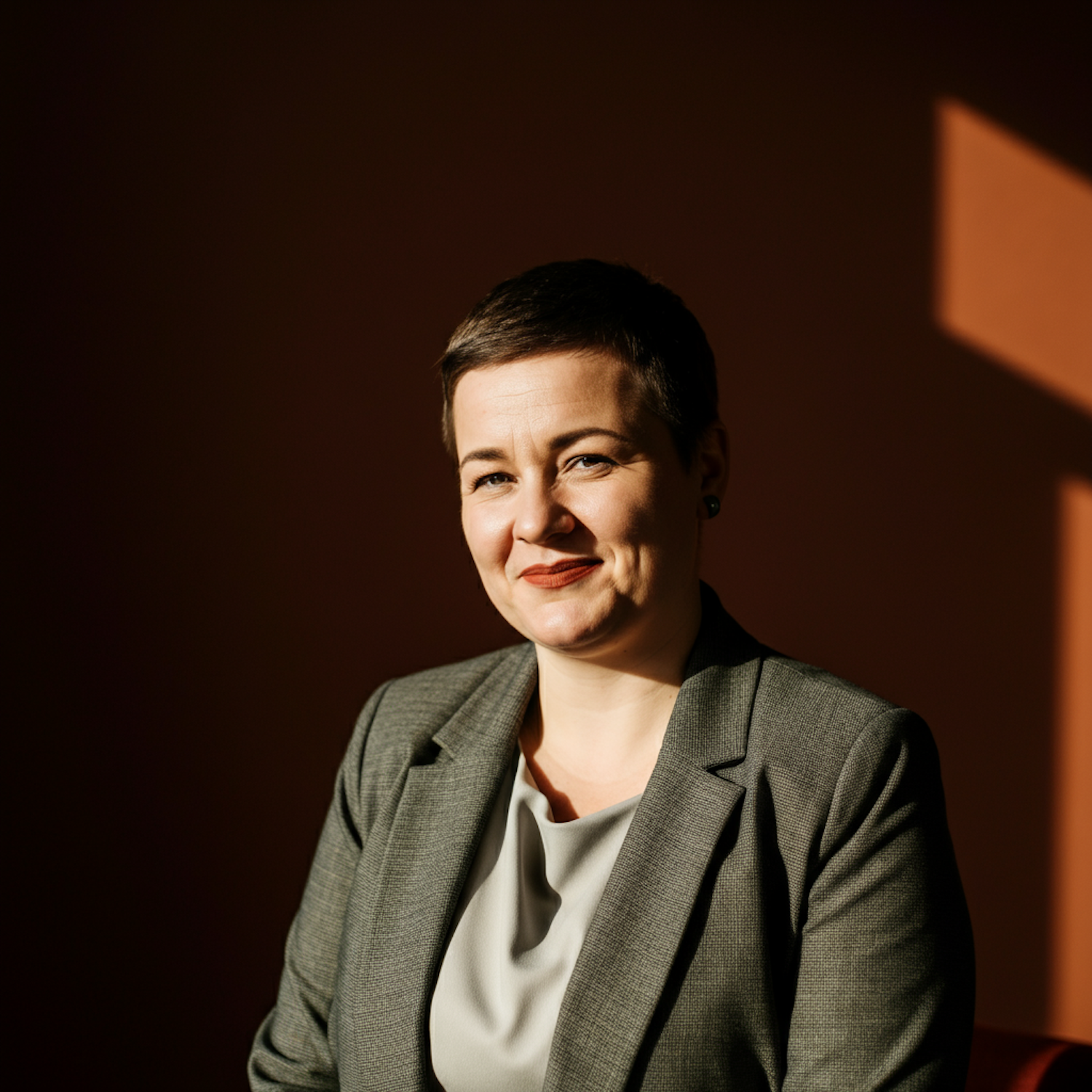 Confident woman in a grey blazer with short hair, highlighted by dramatic lighting against a dark background.