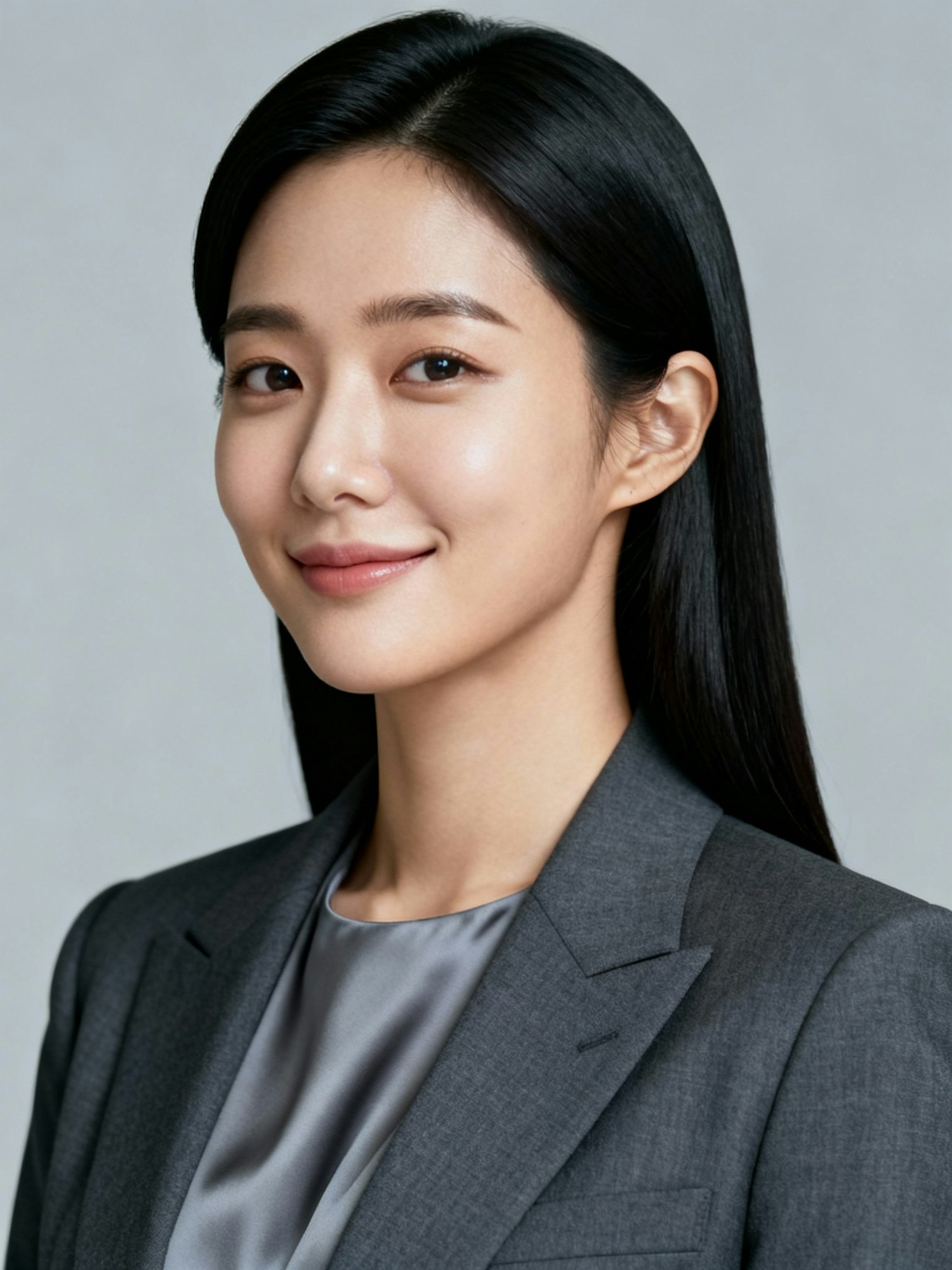 Studio portrait of a South Korean woman corporate-compliance lawyer, age 28; light-medium skin, cool undertone; sleek straight black hair in side part; slate blazer over dove-gray silk top; neutral seamless background; soft beauty lighting with subtle hair light for depth; 105 mm macro-sharp; photorealistic, ultra-HD editorial. Expression: serene intelligence with a faint smile; Skin: luminous, naturally detailed. Negative: over-retouch, plastic sheen, watermarks.