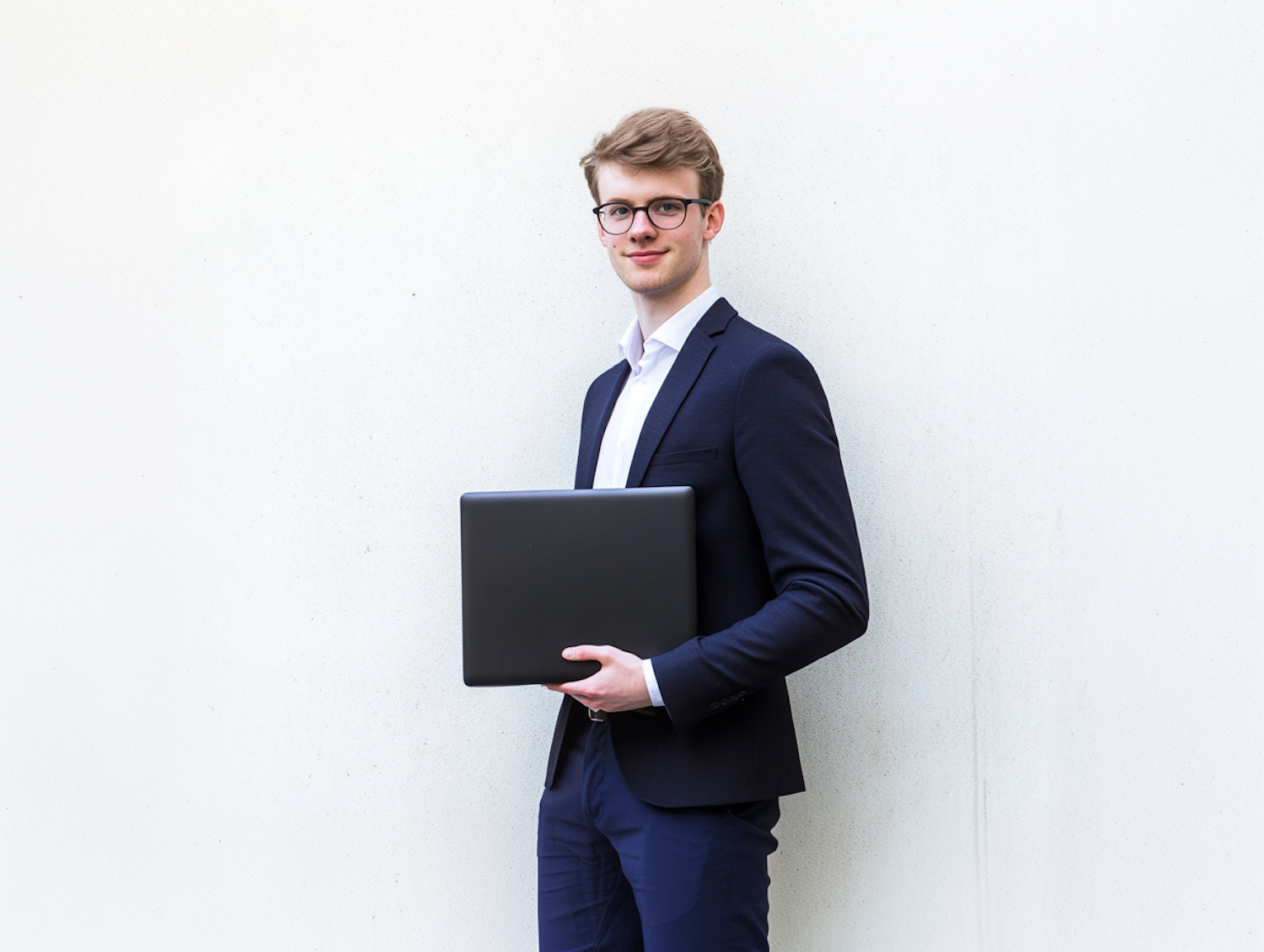 Young man in a navy suit holding a black laptop, standing against a plain white background with a confident and professional look.