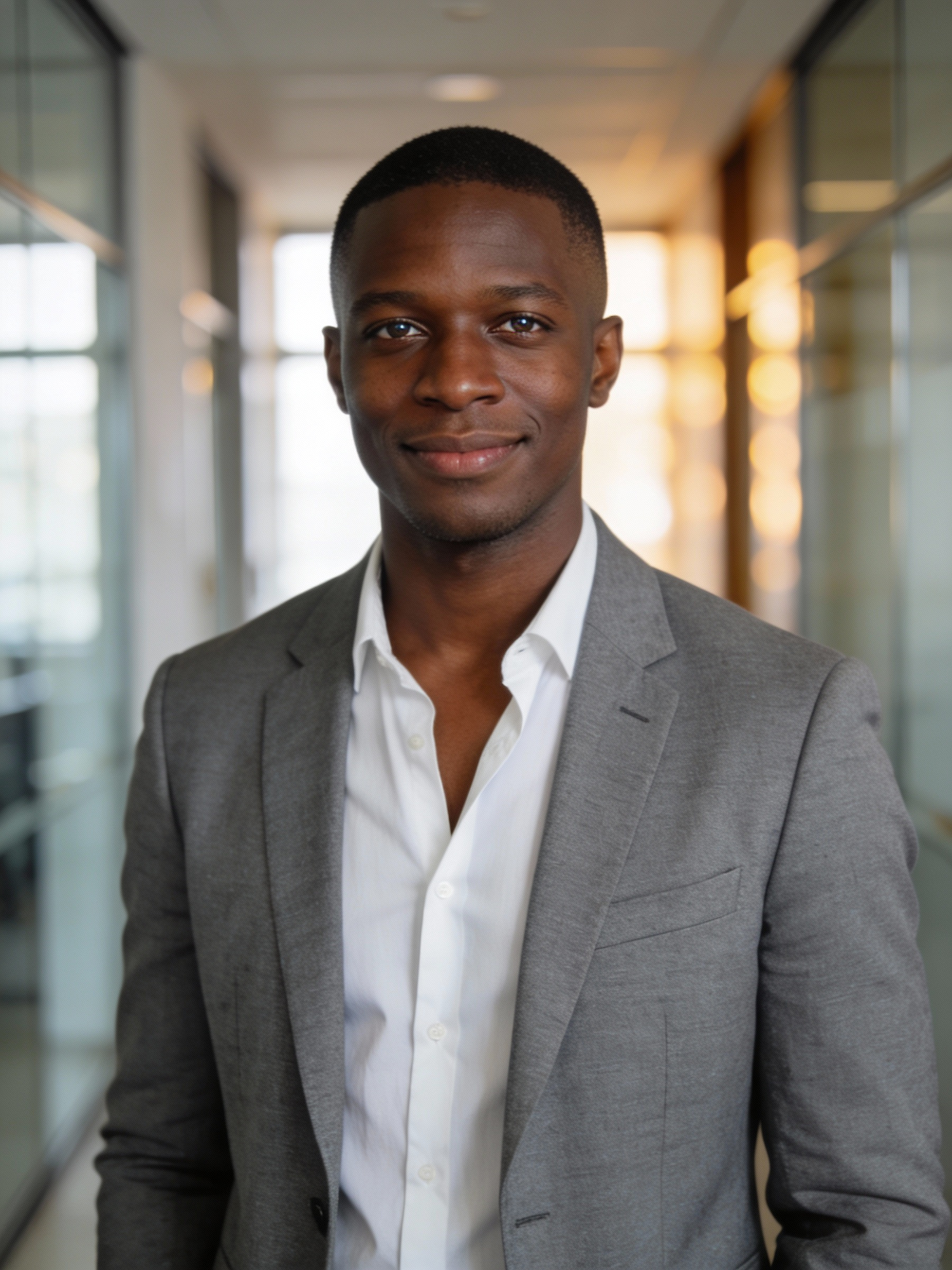 Ultra-realistic professional portrait of a confident Nigerian man (Black), early 30s, calm authority, slight smile, direct eye contact. Outfit: grey sport blazer + white open-collar shirt; trousers implied. Hair: short cropped with a clean fade, neatly groomed. Framing: half-body waist-up, centered, eye-level. Background: modern office corridor with glass partitions and soft warm bokeh, strongly blurred. Lighting: soft window daylight + gentle fill, clean catchlights, subtle rim light, premium corporate/editorial retouch, natural skin texture. 85mm look, shallow depth of field, clean neutral slightly warm color grade, high-end corporate photography, no text, no logos, no watermark.