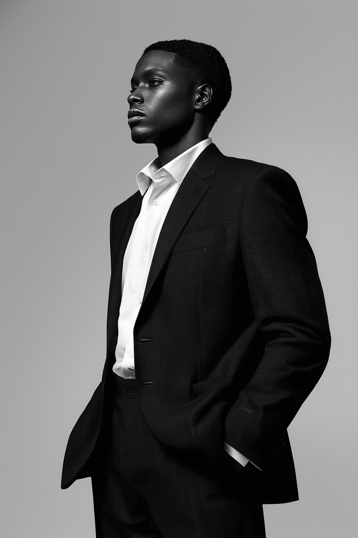 A man in a black suit and white shirt stands confidently against a gray background, showcasing a professional and elegant look.