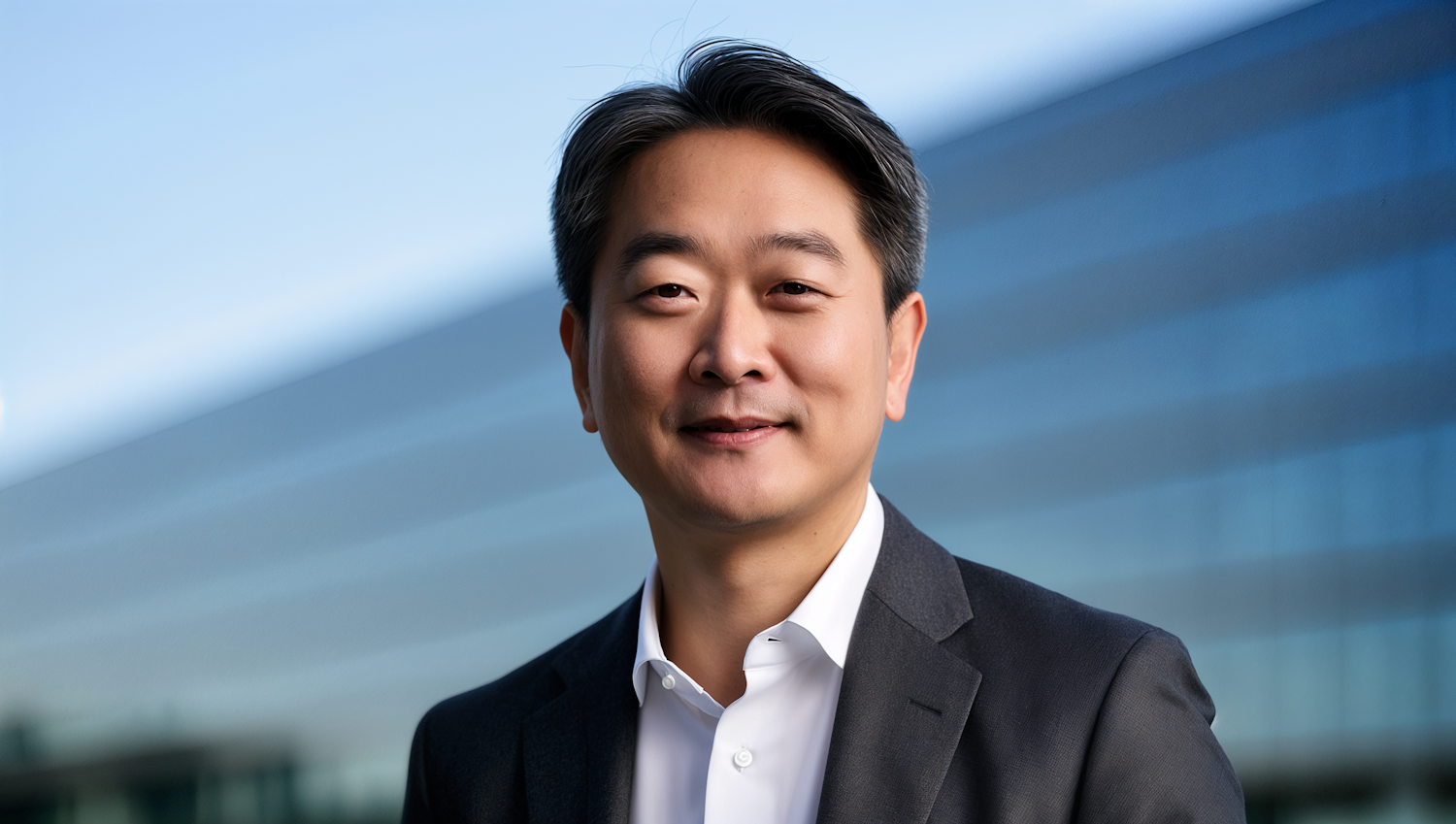 Professional portrait of a man in a suit with a modern glass building background, perfect for corporate or business contexts.