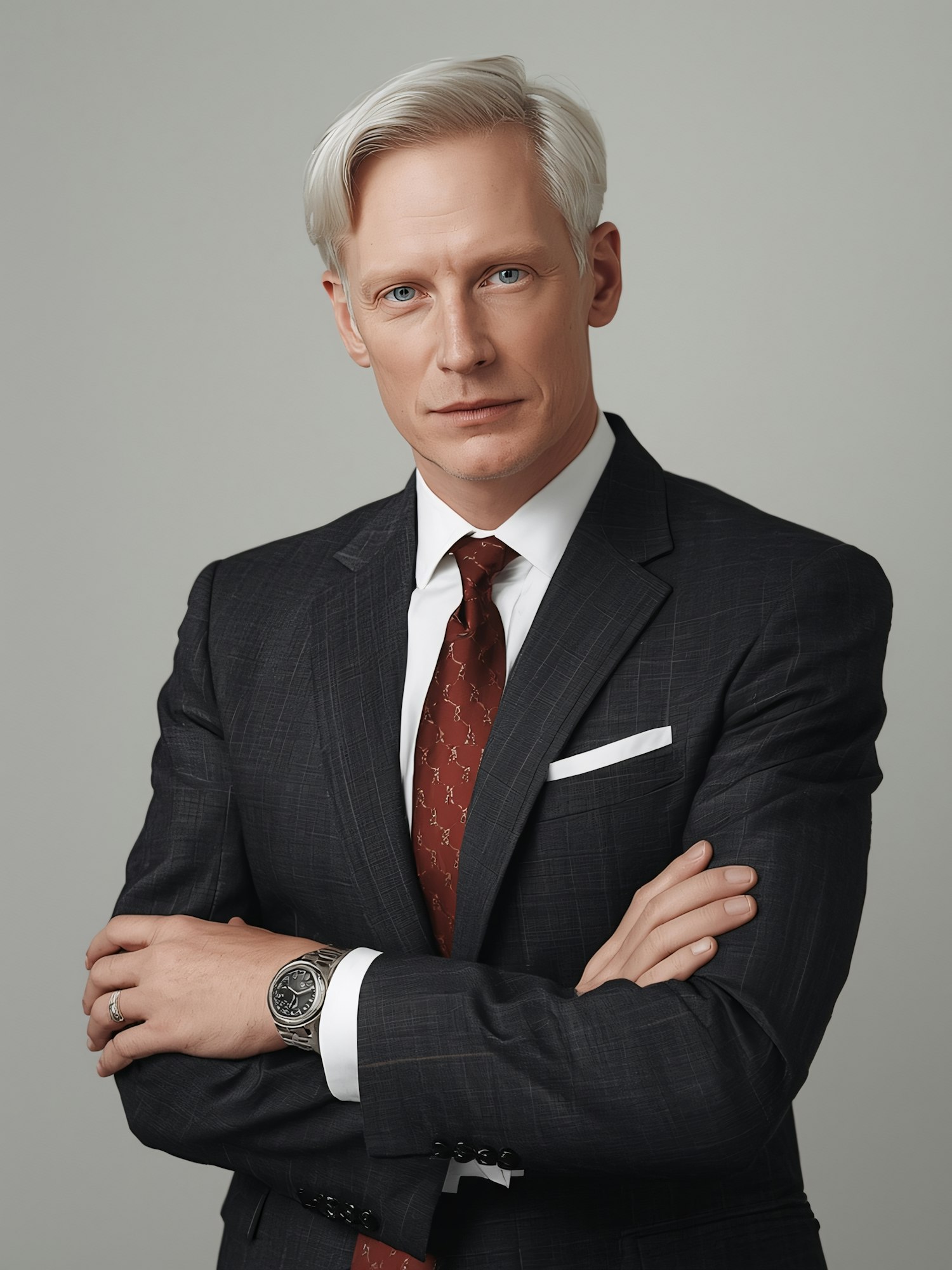 Professional portrait of a man in a dark suit and red tie, with light blonde hair and blue eyes, against a neutral gray background.