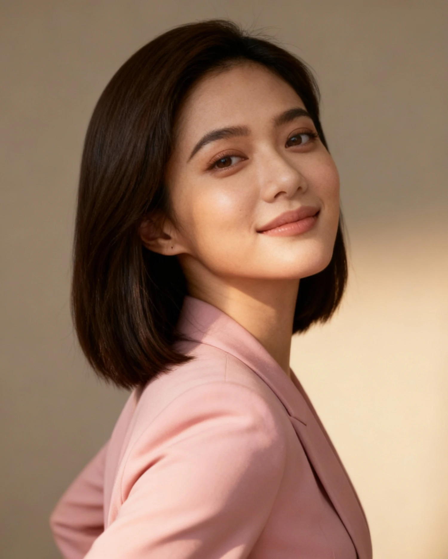 A professional portrait of a woman in a pink blazer, smiling warmly with a soft-lit background.