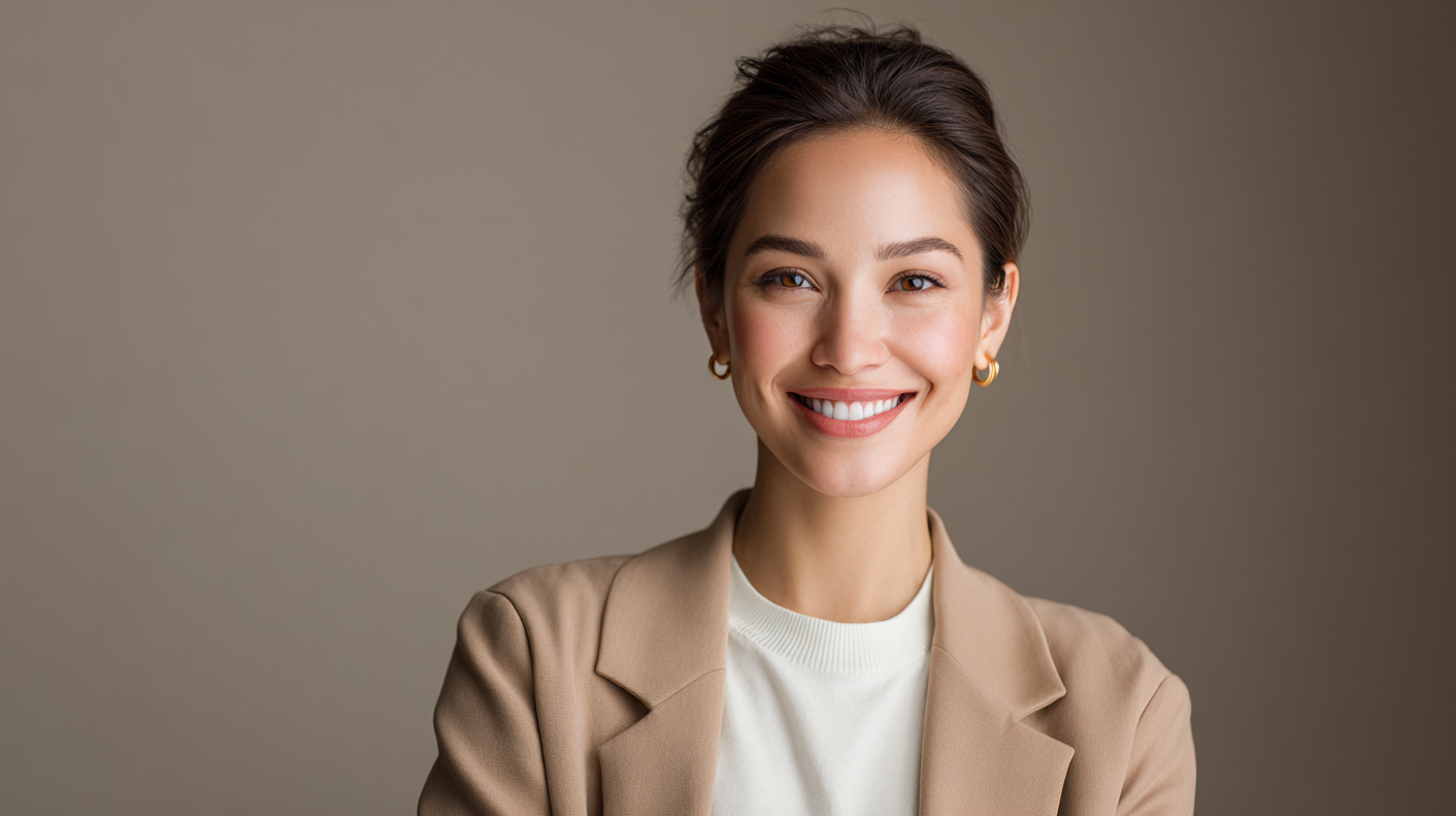 A smiling woman in a beige blazer and white top, accessorized with gold earrings, against a neutral background.