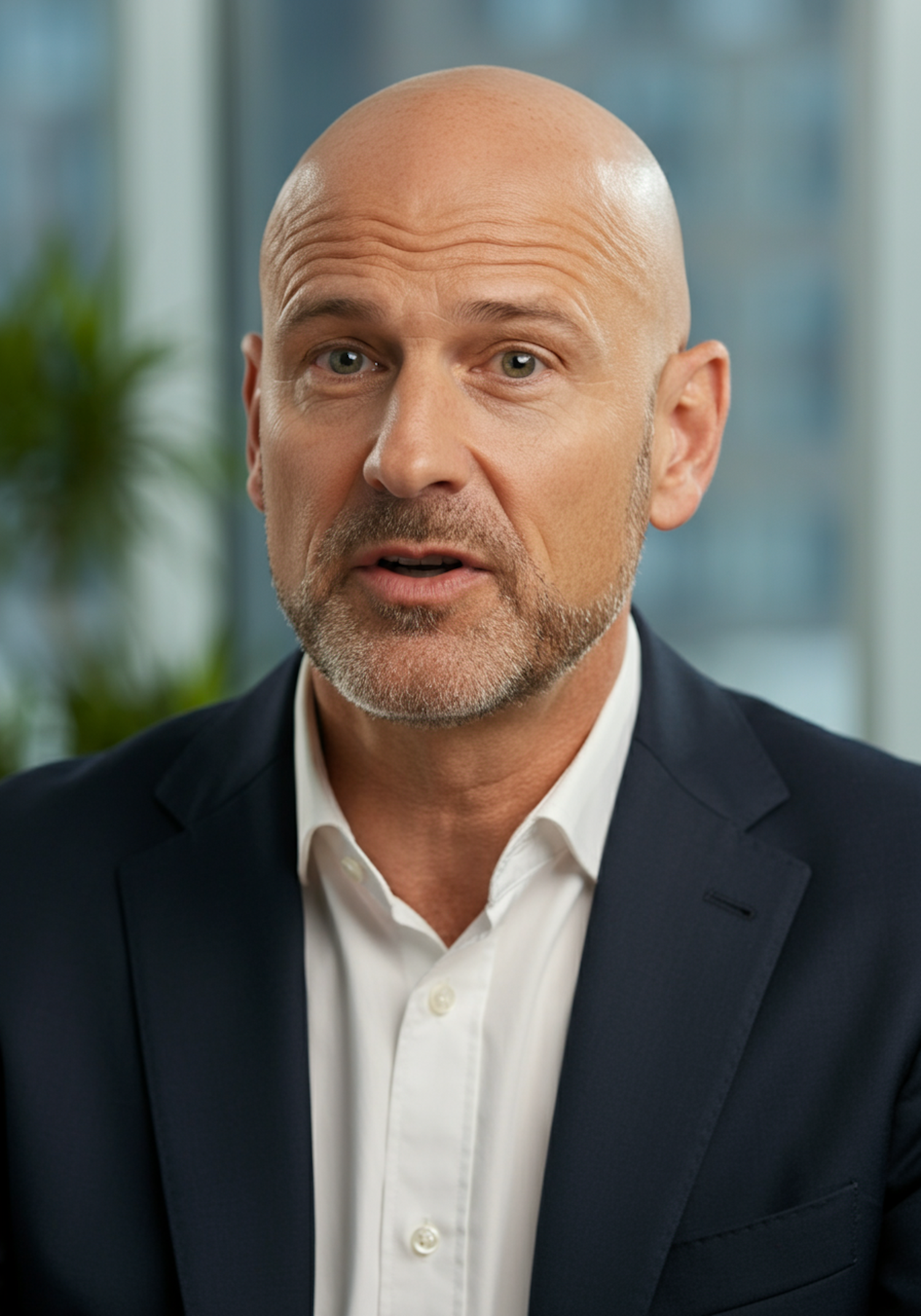A professional portrait of a bald man in a suit, set in an office environment with natural light and a blurred background.