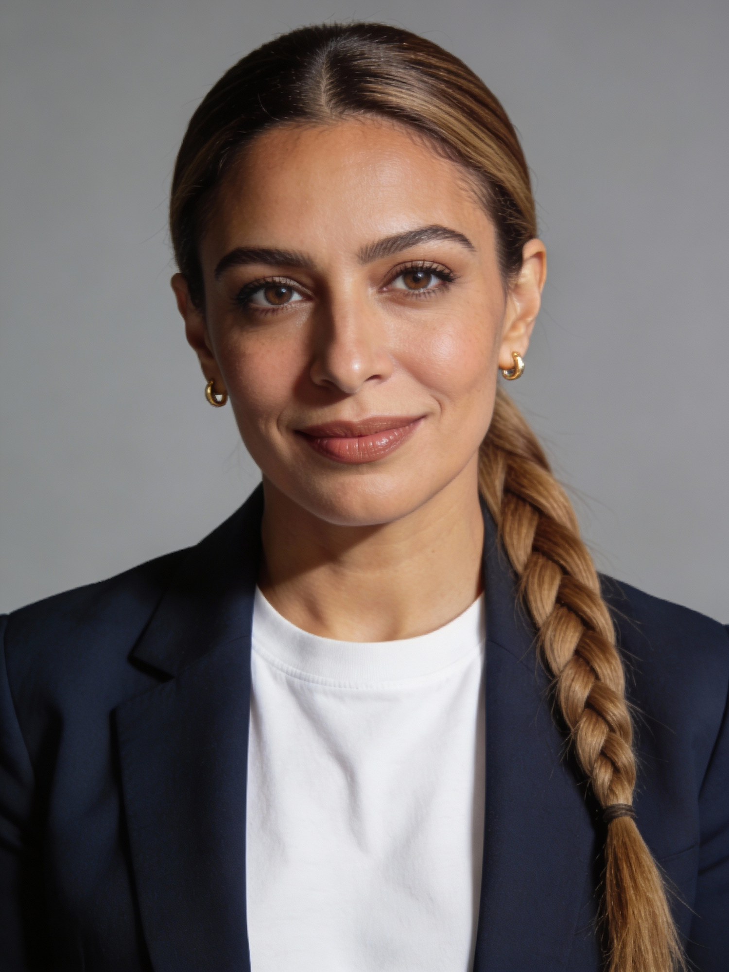 Professional portrait of a woman with a braid, wearing a navy blazer and white shirt, exuding confidence and approachability.