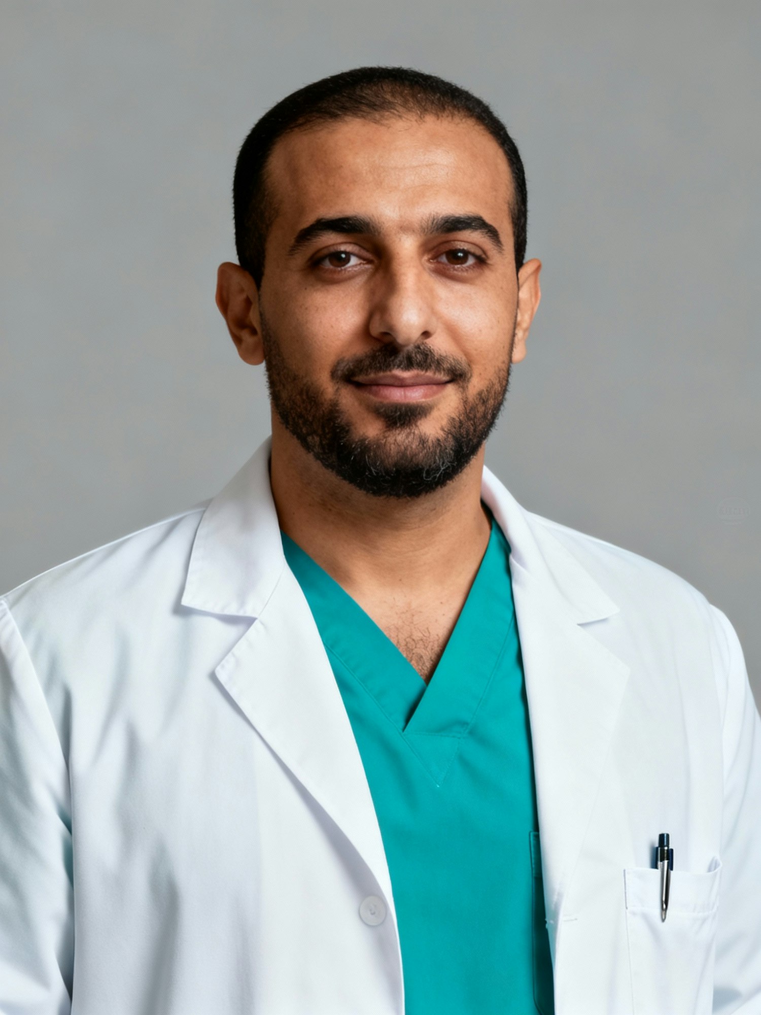 Studio portrait of an Egyptian male anesthesiologist, age 36; medium-tan skin, warm undertone; short neat hair, trimmed beard; teal scrubs with a white coat (non-branded); pen in chest pocket; neutral mid-gray seamless; clamshell soft key + gentle rim; 105mm macro-sharp. Expression: steady professionalism, eyes to camera. Skin: natural, lightly smoothed. Negative: over-retouch, logos, watermarks.