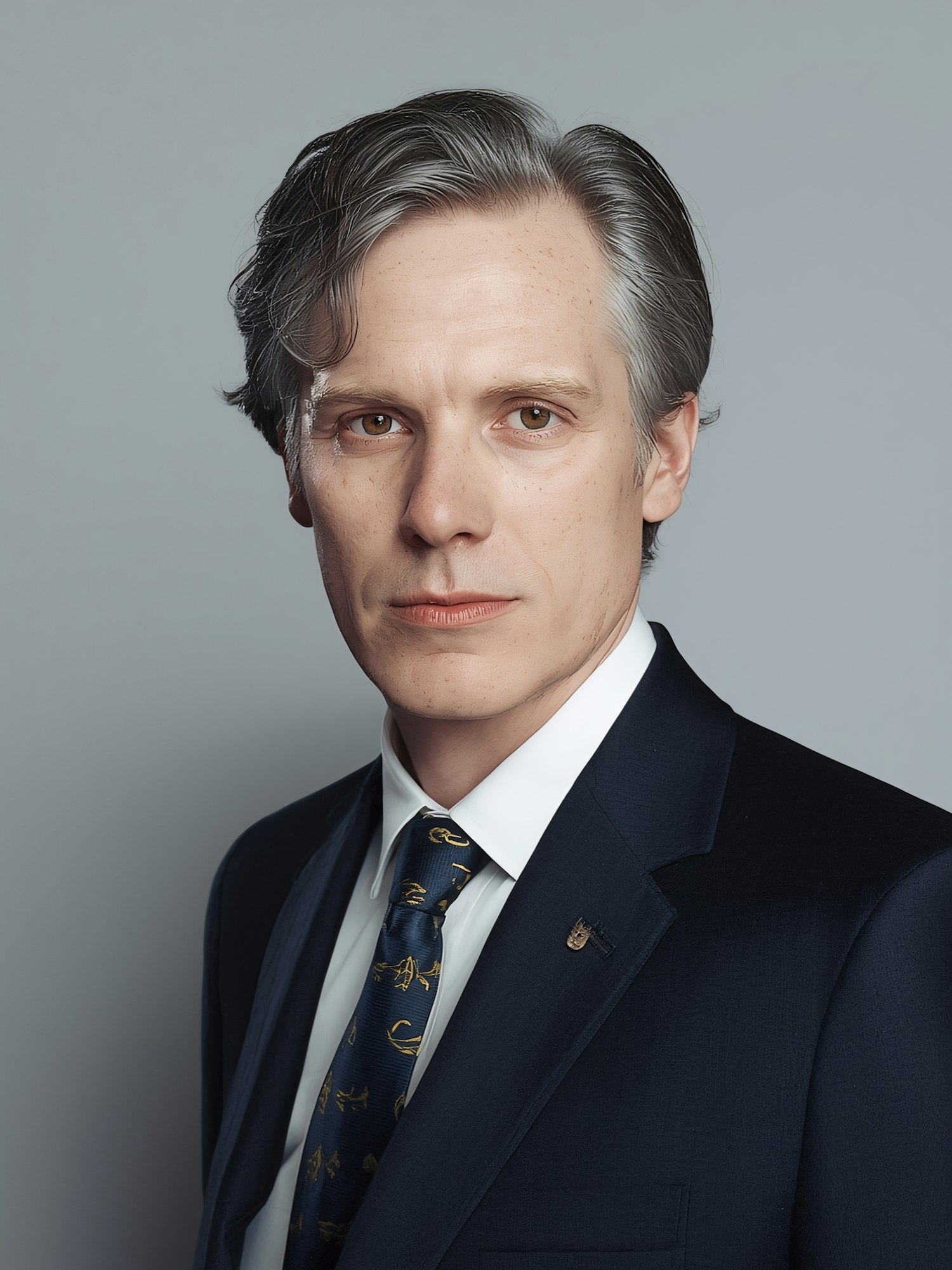 Professional portrait of a man in a dark blue suit and tie, set against a neutral gray background.