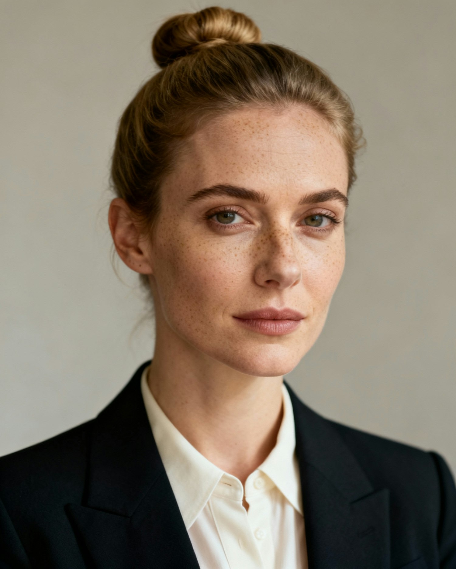 Studio portrait of a French woman product owner; light skin, warm undertone, light freckles; tidy bun; cream blouse under dark blazer; neutral seamless backdrop; Rembrandt lighting; 105mm macro-sharp detail; photorealistic, editorial. Expression: composed professionalism. Negative: “youthifying” skin blur, exaggerated wrinkle removal.