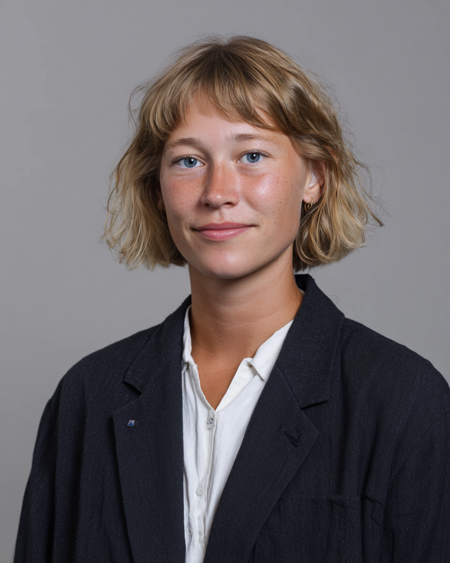 Portrait of a person with short blonde hair, blue eyes, and a calm expression, wearing a dark blazer and white shirt against a gray background.