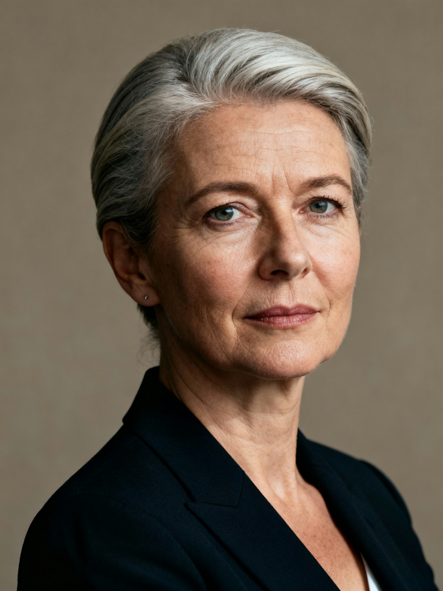 Studio portrait of a German woman CTO in her fifties; light skin, neutral undertone; salt-and-pepper hair; tailored dark blazer; neutral seamless backdrop; Rembrandt lighting; 105mm macro-sharp detail; photorealistic, editorial. Expression: steady authority. Negative: “youthifying” skin blur, exaggerated wrinkle removal.