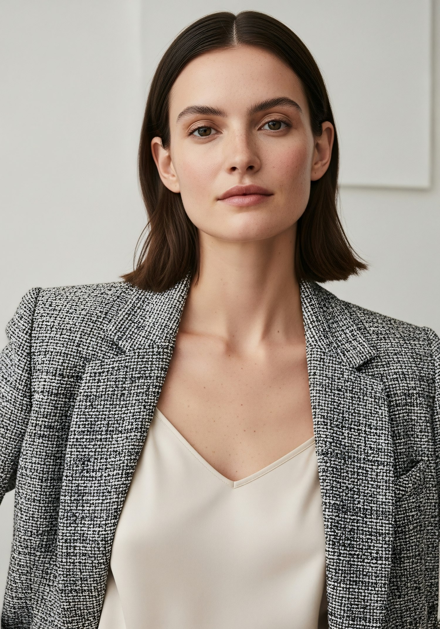 A professional portrait of a woman in a gray blazer and cream top, with a neutral expression and a clean, minimal background.