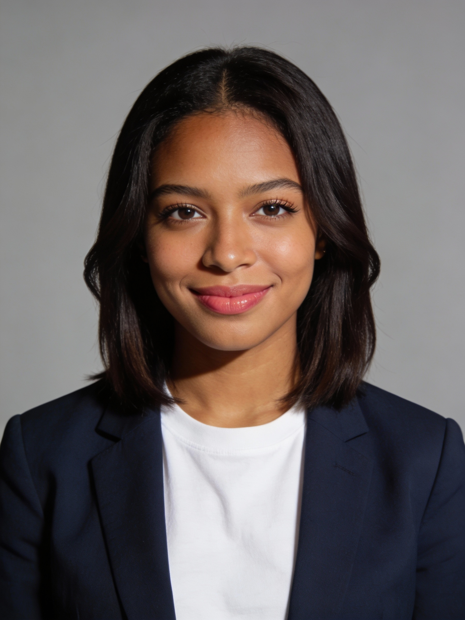 A young woman with dark hair and a navy blazer smiles gently against a neutral background, exuding professionalism and warmth.