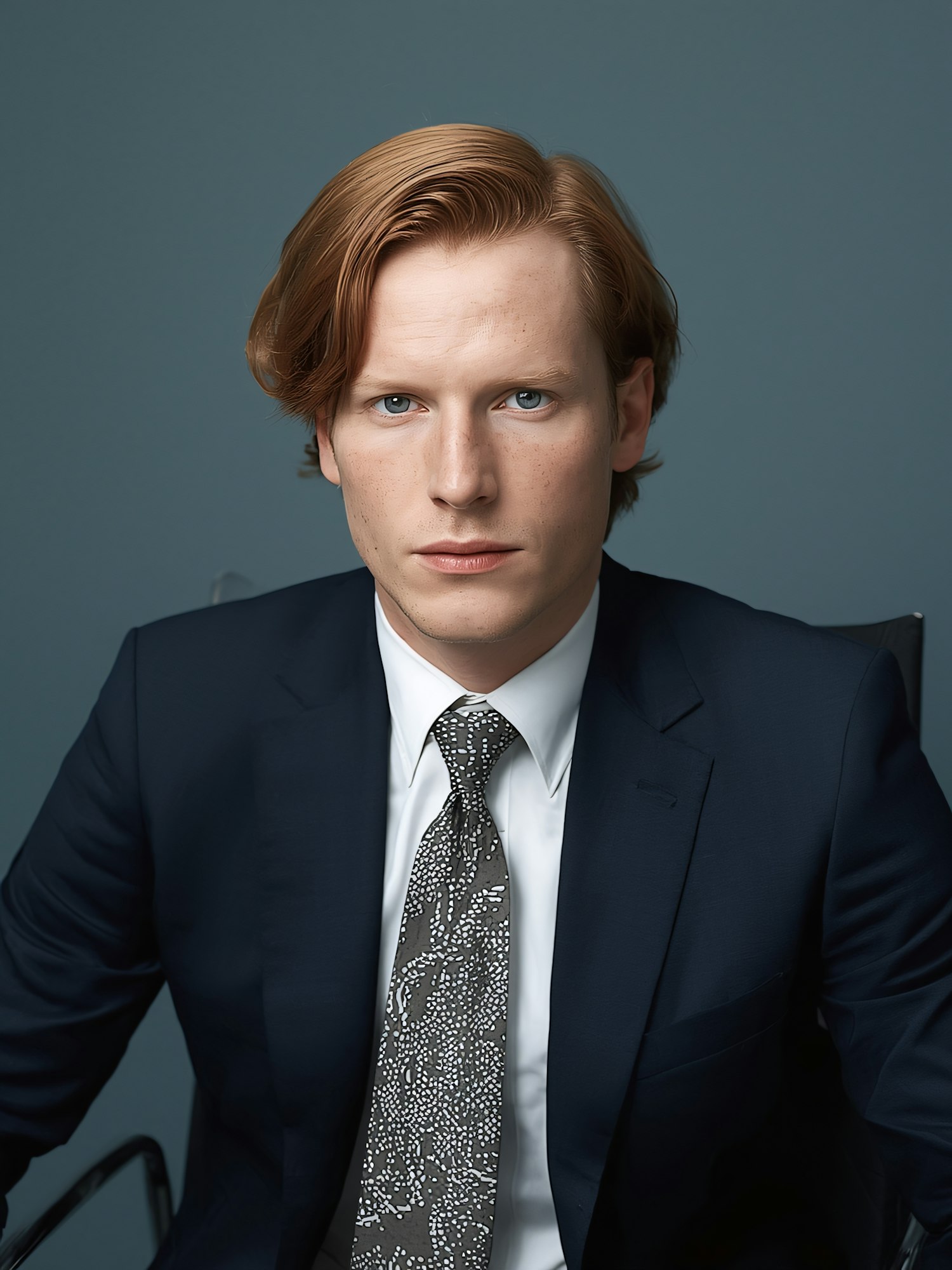 Professional portrait of a man in a navy suit with auburn hair and blue eyes, set against a muted blue background.